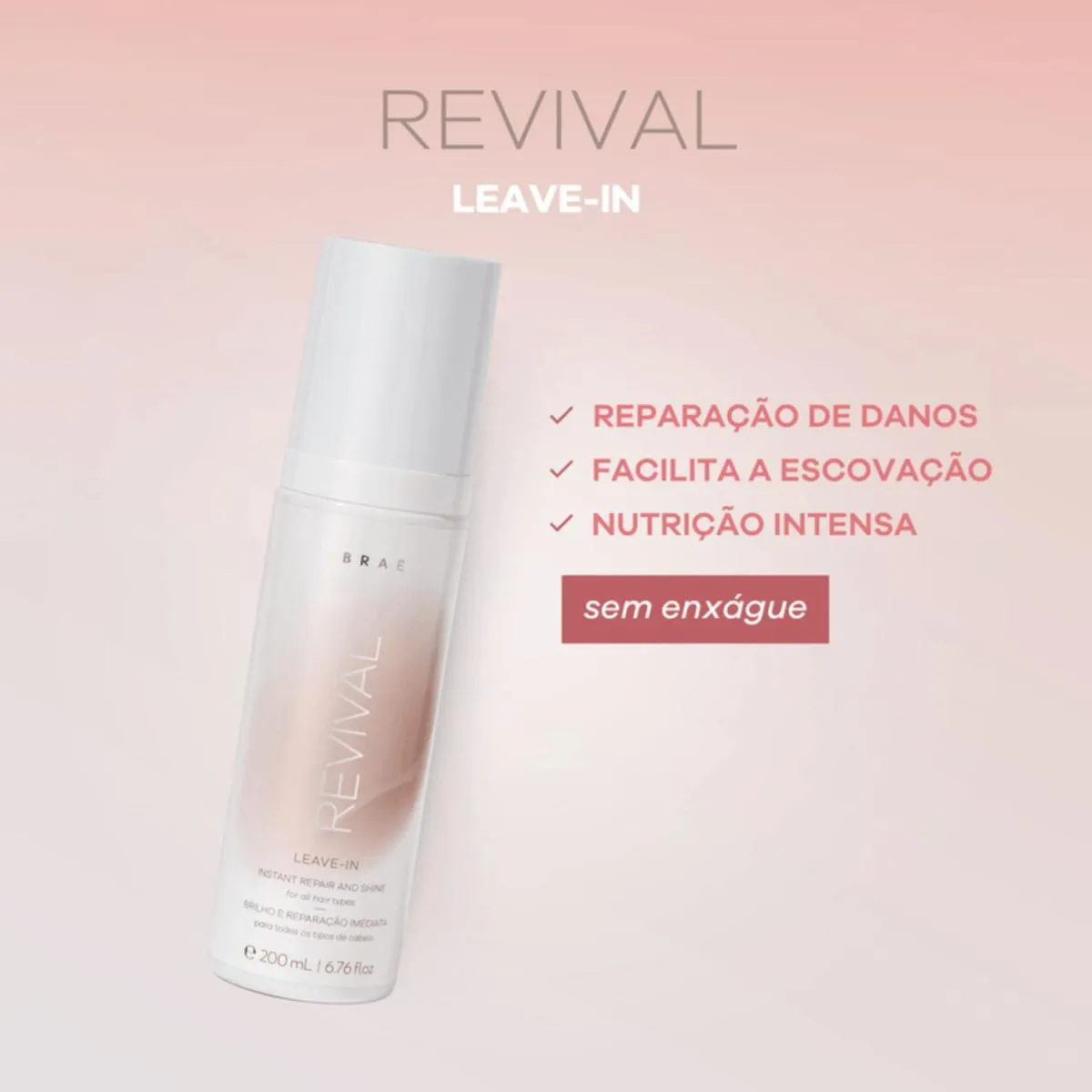 Braé Revival finalizador 200ml é um tratamento leave-in reconstrutor que hidrata, repara e protege profundamente os cabelos danificados, restaurando a força, o brilho e a maciez. Ideal para fios fragilizados por processos químicos, ele atua na reconstrução capilar, devolvendo vitalidade e resistência.