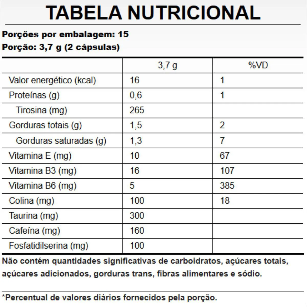 - Suporte para desempenho cognitivo com blend de ingredientes como cafeína, taurina, vitaminas B3 e B6.