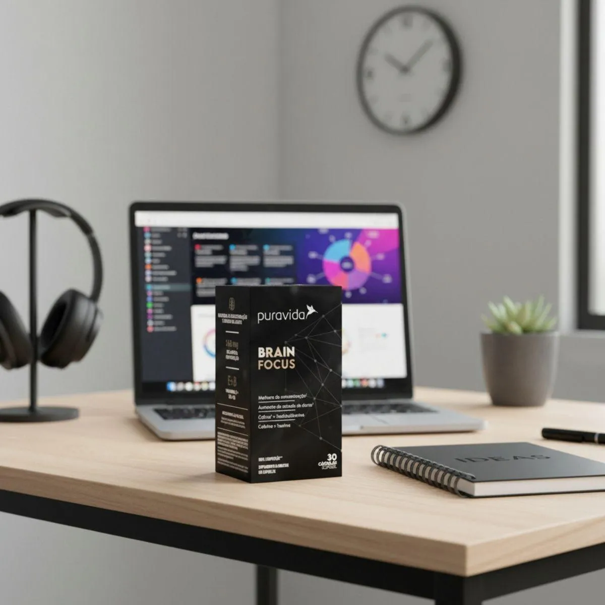 É um suplemento alimentar desenvolvido para apoiar funções cognitivas, com foco em melhorar a concentração e o estado de alerta. O produto contém uma composição que inclui cafeína, vitaminas do complexo B, colina e fosfatidilserina, destinando-se a auxiliar no desempenho mental, proporcionando suporte para pessoas que buscam maior foco e energia mental durante suas atividades diárias.