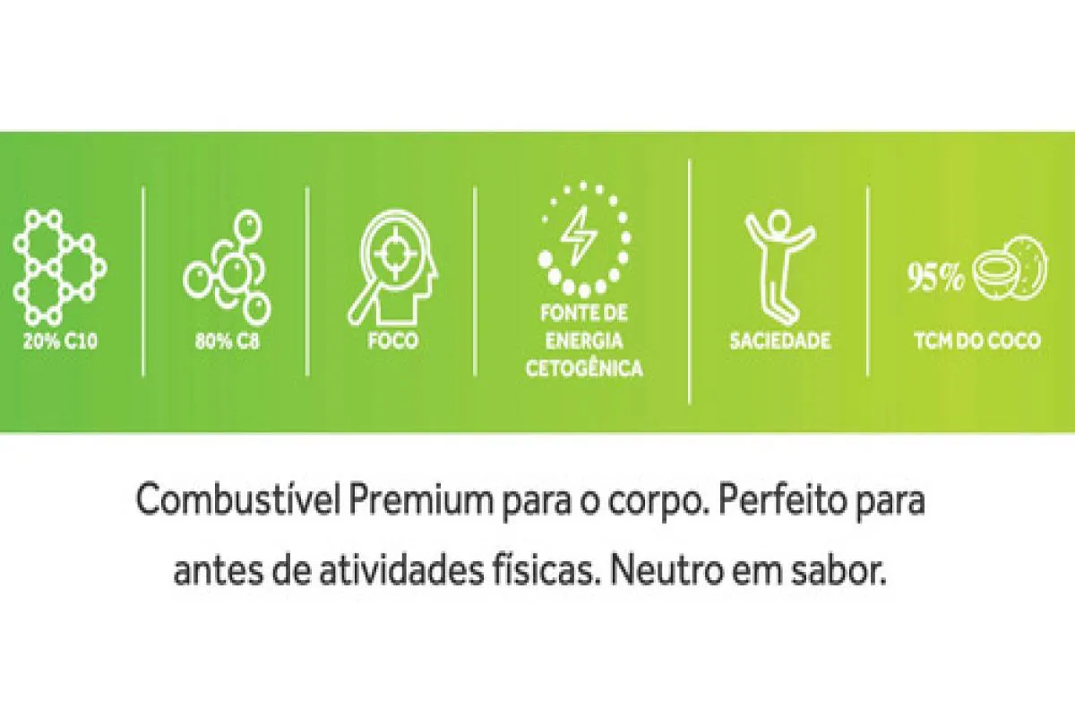 Este produto tem a proporção ideal dos TCM C8 e C10, sendo 80% de C8 e 20% de C10. O C8, por ser absorvido muito rápido e ofertar energia imediata, e o C10 por ofertar energia mais duradoura.
