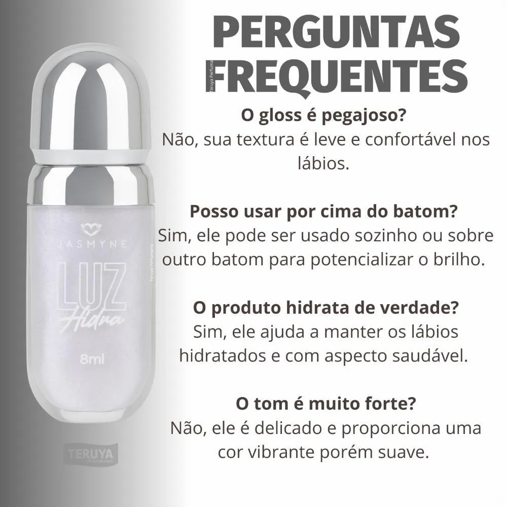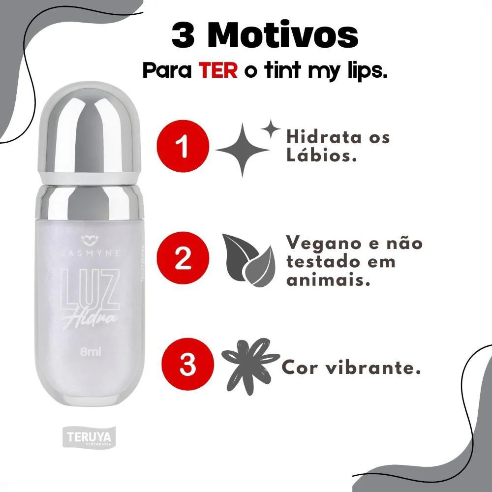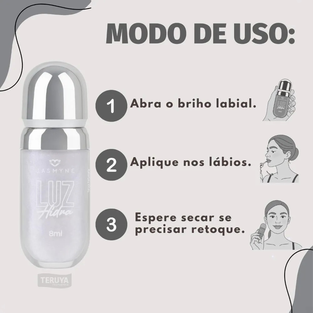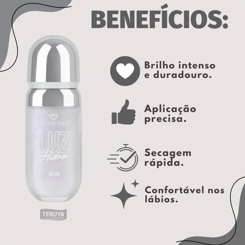Fórmula Luz Hidra exclusiva da JASMYNE, que combina brilho e hidratação em um só produto.Embalagem compacta e elegante, perfeita para levar na bolsa e retocar o brilho a qualquer momento.Produto não testado em animais, garantindo um consumo consciente e responsável.