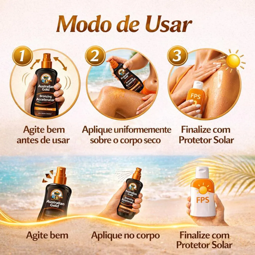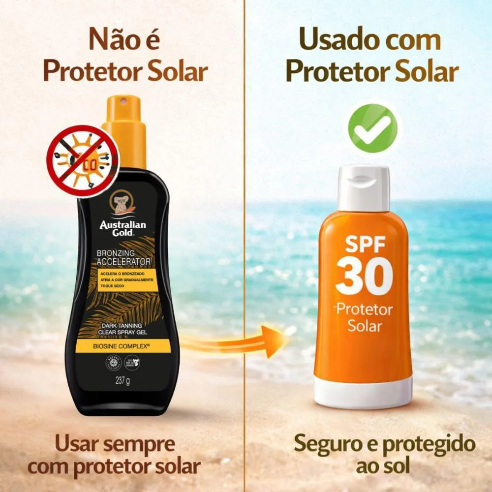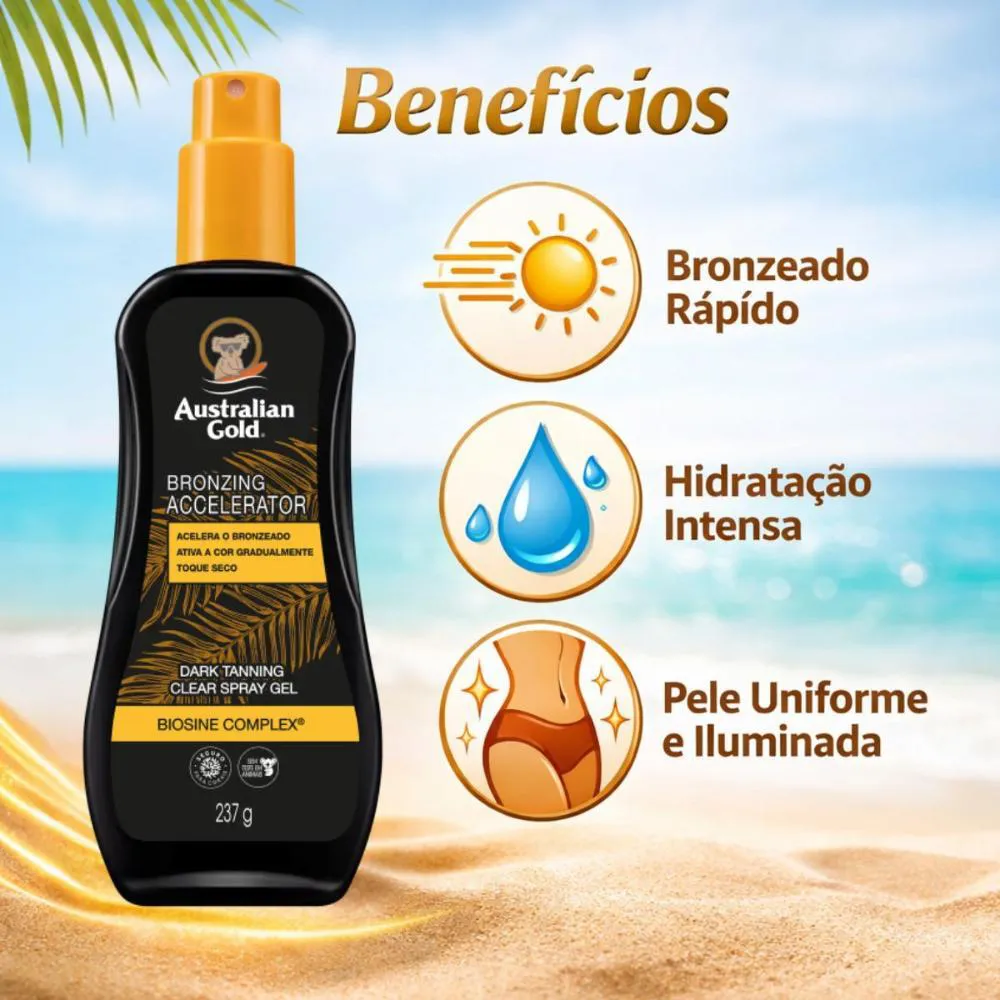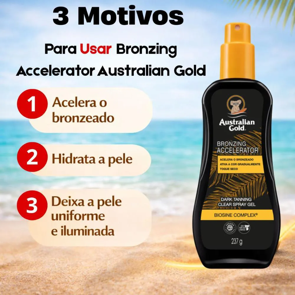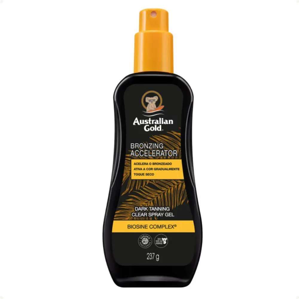 O Australian Gold Bronzing Accelerator é um bronzeador em spray gel que ajuda a acelerar o bronzeado natural, ativando a cor de forma gradual enquanto cuida da pele. Sua fórmula com Biosine Complex® e ativos hidratantes promove um bronzeado mais uniforme, bonito e radiante.Benefícios Principais