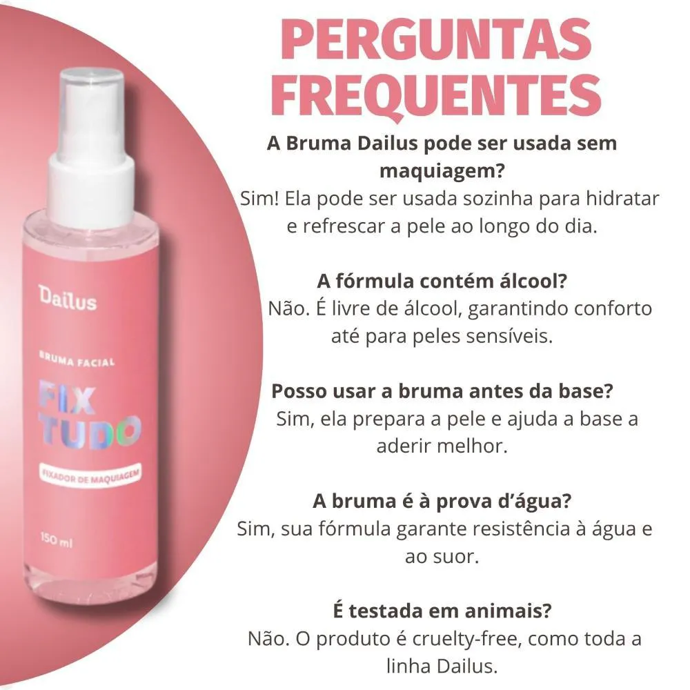 A Bruma Facial Dailus Fix Tudo é a sua aliada perfeita em diversas situações. Use-a antes da maquiagem para preparar a pele, garantindo uma hidratação equilibrada e uma base uniforme. Durante a aplicação, borrife para intensificar as cores e fixar os produtos, prolongando sua durabilidade. Após finalizar a maquiagem, aplique para selar o look, garantindo que ele permaneça impecável em eventos especiais, no trabalho, em viagens ou em qualquer ocasião em que você queira se sentir confiante e radiante.Modo de Uso/Aplicação: