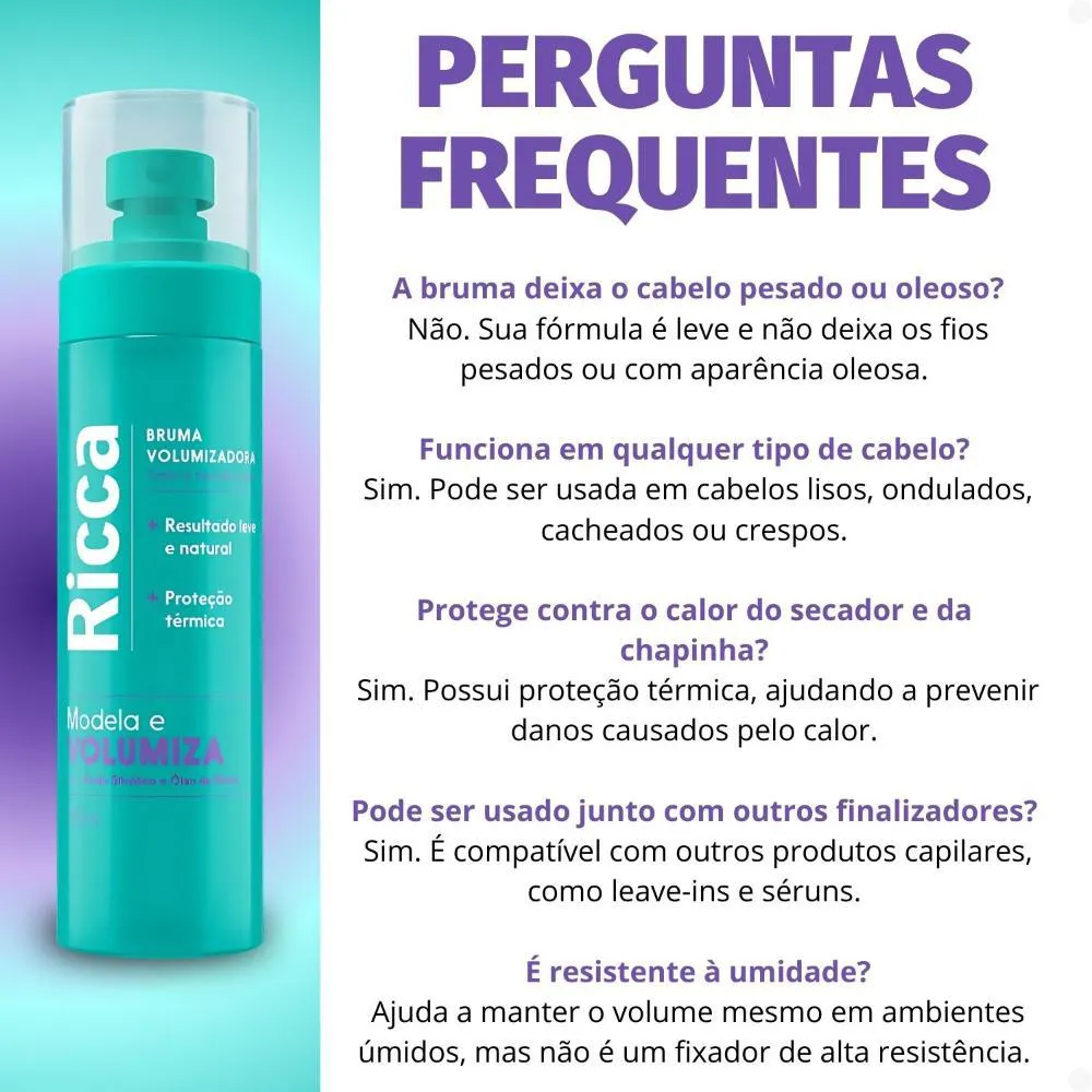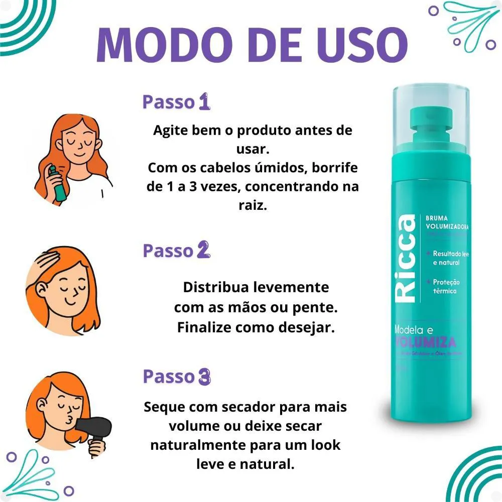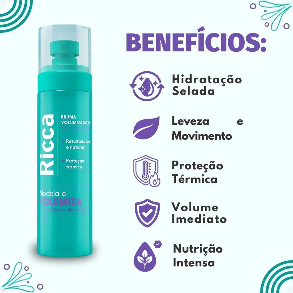 A Bruma Volumizadora Ricca é a escolha ideal para quem busca volume e leveza nos fios! Sua fórmula inovadora modela e volumiza o cabelo de forma natural, sem pesar. Com Ácido Glicólico e Óleo de Rícino, ela proporciona proteção térmica e nutrição aos fios, garantindo um resultado impecável, cheio de movimento e estilo. Este produto é perfeito para todos os tipos de cabelo, oferecendo um acabamento leve e natural.Benefícios Principais