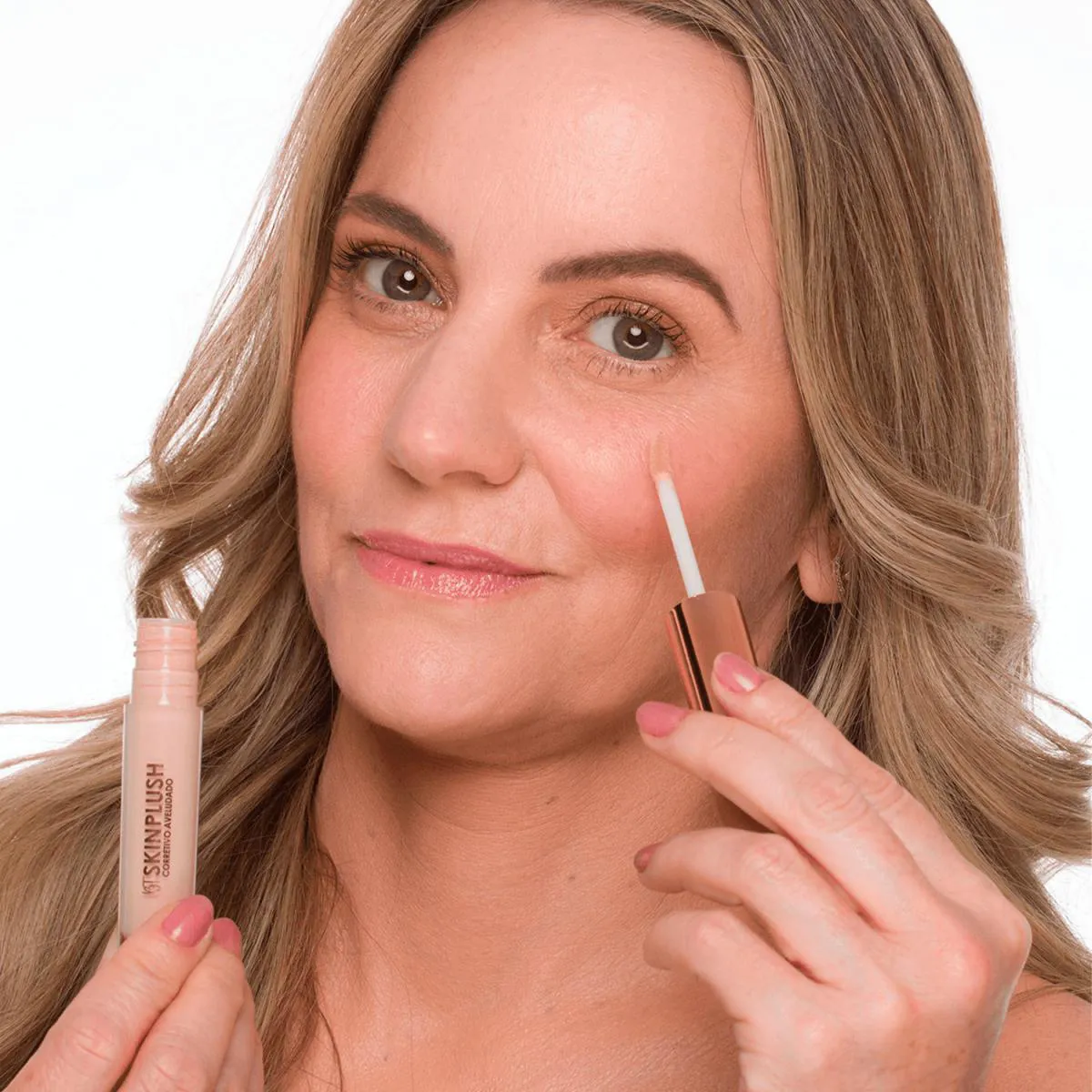 Um corretivo de textura soft mousse que oferece uma cobertura de leve a média e acabamento aveludado. Além de corrigir, iluminar e camuflar, o BT Skinplush conta com diversos ativos que ajudam a atenuar a aparência das olheiras e bolsas ao redor dos olhos. Ele também auxilia na hidratação e melhora da elasticidade da pele. Possui uma textura mousse, versátil e aveludada que garante maior conforto ao longo do uso. Ele é resistente à água, suor e oleosidade.