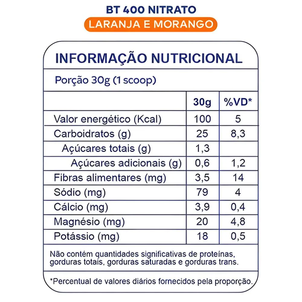 BT 400 Nitrato é um suplemento em pó desenvolvido para melhorar a performance e a resistência durante os treinos. Formulado com nitrato natural da beterraba, carboidratos e eletrólitos, ajuda a otimizar a eficiência energética e a reduzir a fadiga muscular. Diferenciais da fórmula