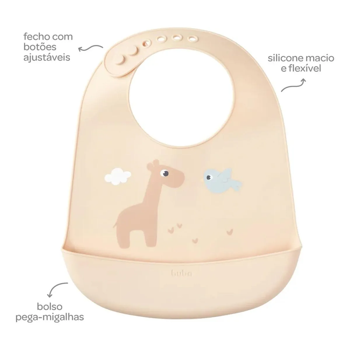 O Babador em Silicone Cloudy Bege da Buba é perfeito para manter o bebê limpinho durante as refeições. Possui design moderno, confortável e funcional, com bolso pega-migalhas que ajuda a evitar sujeiras e desperdício. Características:- Bolso coletor para restos de comida e líquidos