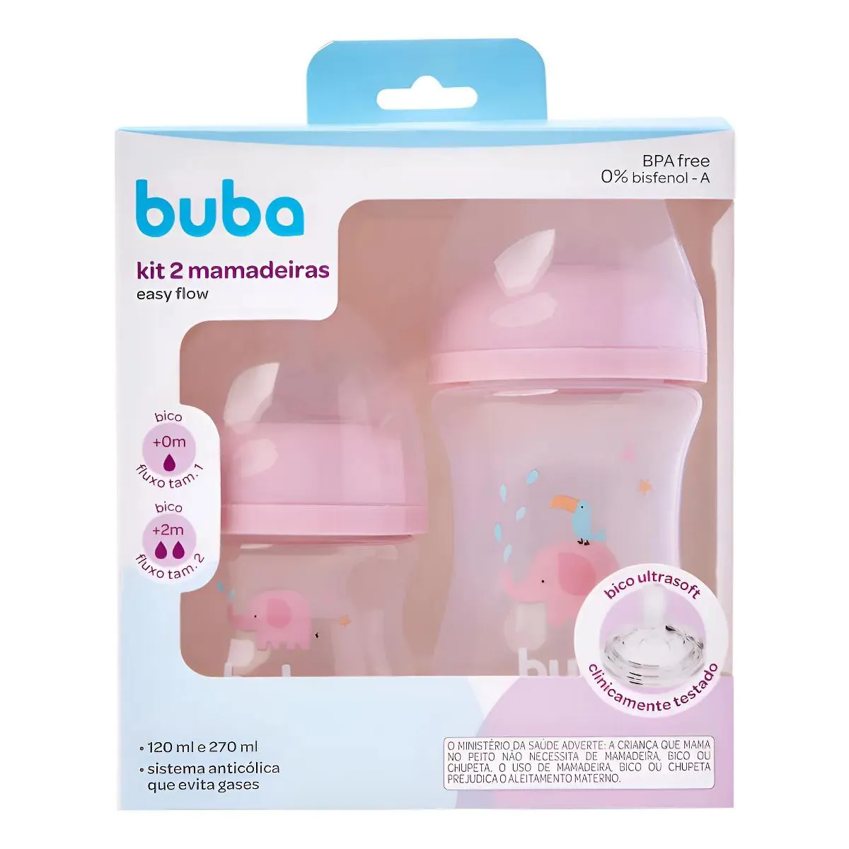 Buba Kit 2 mamadeiras Easy Flow Elefante Rosa 120ml e 270ml