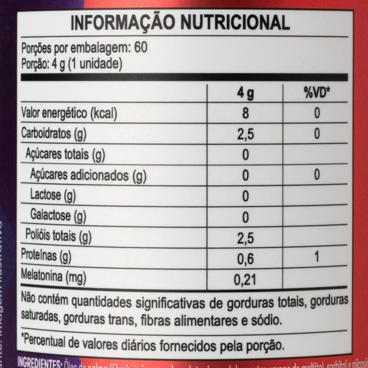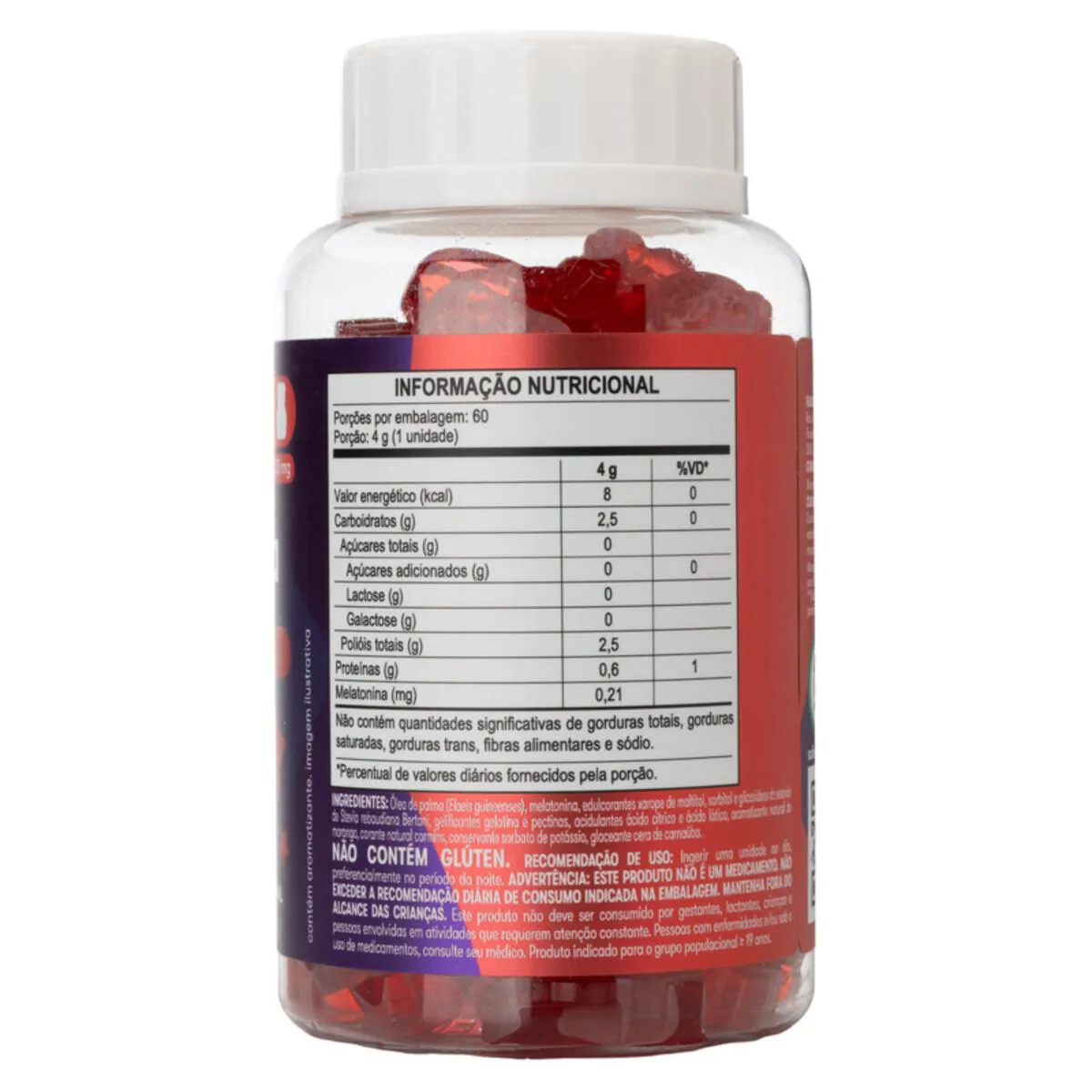Óleo de palma (Elaeis guineenses), melatonina, edulcorantes xarope de maltitol, sorbitol e glicosídeos de esteviol de Stevia rebaudiana Bertoni, gelificantes gelatina e pectinas, acidulantes ácido cítrico e ácido lático, aromatizante natural de morango, corante natural carmins, conservante sorbato de potássio, glaceante cera de carnaúba.
