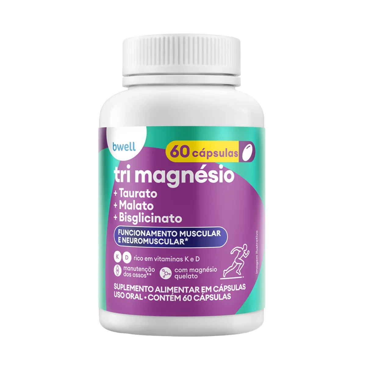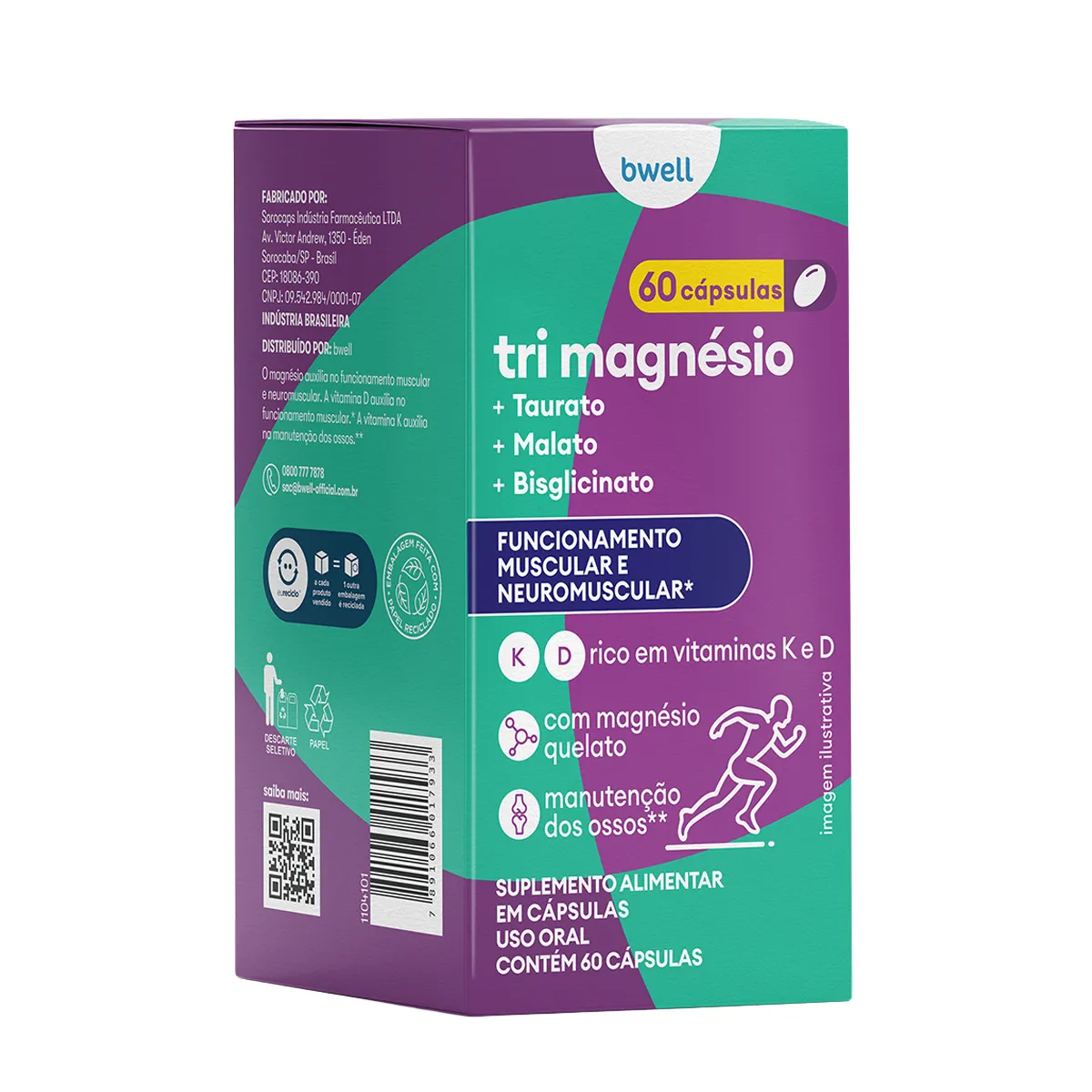 O Tri Magnésio Bwell é um suplemento alimentar em cápsulas gelatinosas que combina três formas queladas de magnésio — taurato, malato e bisglicinato — com vitaminas D e K, oferecendo um suporte completo para o seu bem-estar.