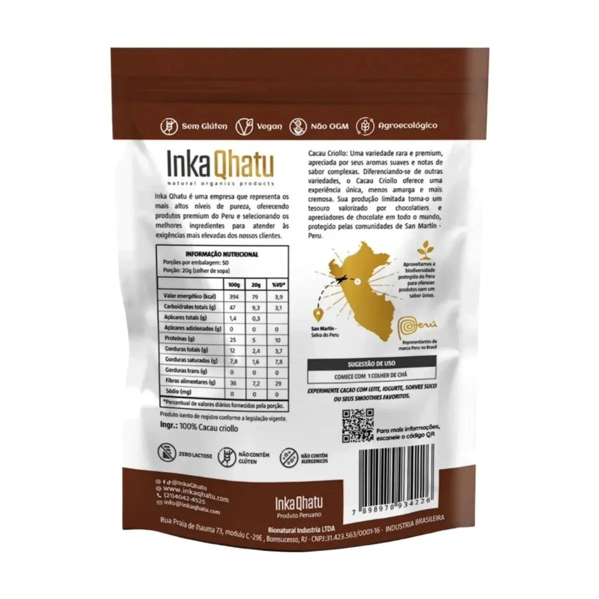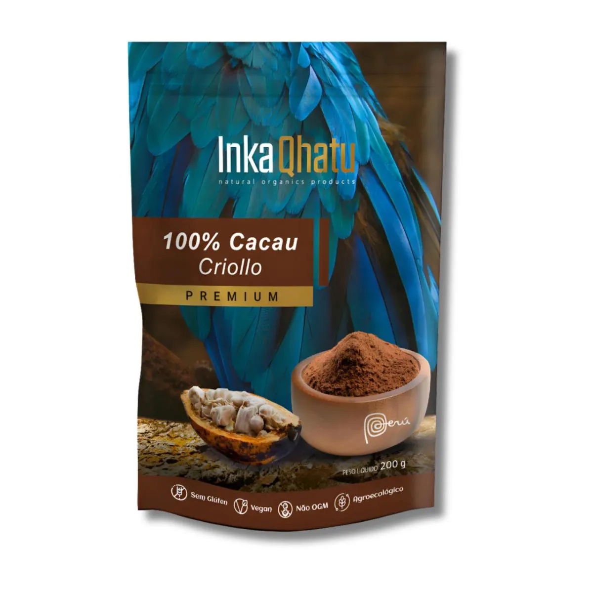 O Cacau Criollo 100% Cacau em Pó Inka Qhatu é um produto de origem vegetal, apresentado em embalagem de 200 g. Obtido a partir de grãos de cacau da variedade Criollo, é moído até atingir textura fina, adequado para uso em bebidas, receitas e preparações culinárias diversas.