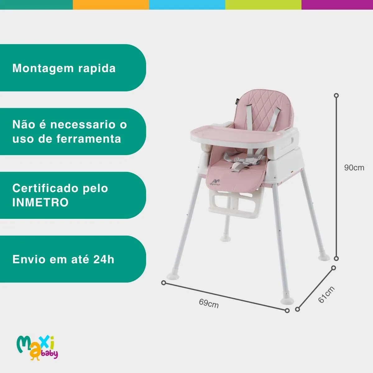 - Segurança garantida com cinto de 5 pontos e base antiderrapante, proporcionando estabilidade total durante as refeições.