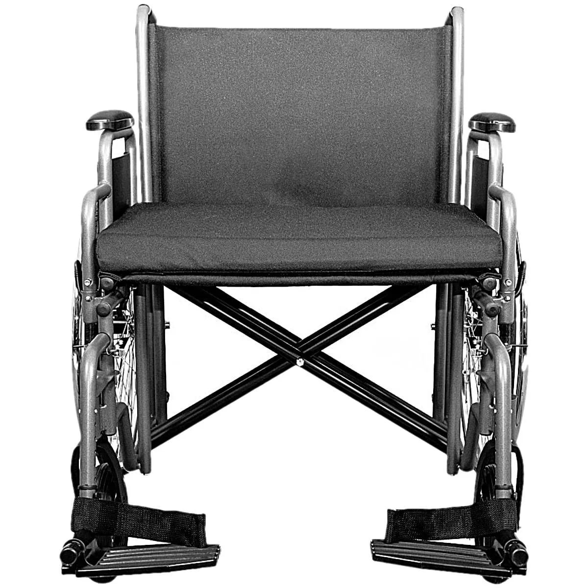 - Apoios de pés: com remoção rápida (swing away), rebatível, com faixa de apoio para calcanhar e com ajuste de altura por pino click de engate rápido.