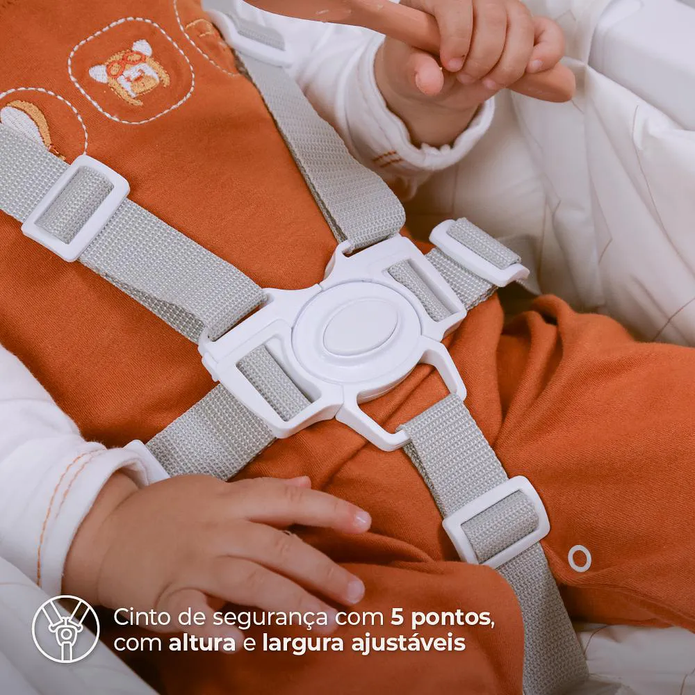 - Cinto de 5 pontos para segurança reforçada.