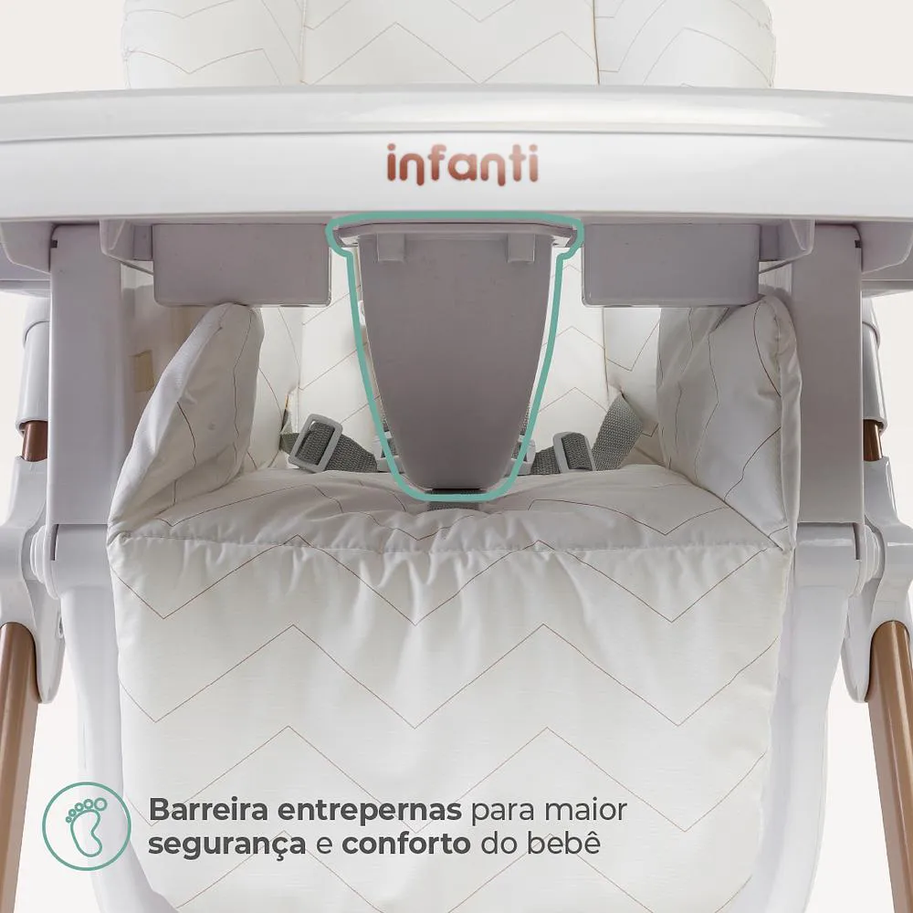 Cadeirinha de Alimentação Panacota - InfantiBRBRA cadeira de Refeição Panacota da Infanti é perfeita para acompanhar o crescimento do seu bebê desde os 6 meses até 23 kg, unindo conforto, segurança e praticidade com um design moderno e funcional. Ideal para transformar as refeições em momentos de cuidado, interação e desenvolvimento.BRBRCaracterísticas do Produto:BR• Uso prolongado: Indicada para crianças de 6 meses até 23 kg.BR• Ajuste de altura: 7 posições para acompanhar o crescimento da criança.BR• Encosto reclinável: 3 níveis de inclinação para mais conforto nas refeições.BR• Apoio para os pés: Ajustável em 3 posições, adaptando-se a cada fase.BR• Bandeja dupla removível: Espaçosa, com porta-copos e lavável em lava-louças.BR• Capa acolchoada: Macia, impermeável e fácil de limpar.BR• Estrutura dobrável: Fecha de forma compacta e permanece em pé.BR• Armazenamento prático: Bandeja pode ser acoplada à estrutura ao ser guardada.BR• Segurança reforçada: Cinto de 5 pontos com ajustes e barreira entrepernas.BR• Design elegante: Inspirado no estilo italiano, combina com diversos ambientes.BR• Certificação: Aprovada pelo INMETRO, garantindo confiabilidade e segurança.BRBREspecificações Técnicas:BR• Indicação: De 6 meses até 23 kgBR• Posições de altura: 7BR• Encosto: Reclinável em 3 posiçõesBR• Bandeja: Dupla, removível, com porta-copos e local de armazenamentoBR• Apoio para os pés: 3 posiçõesBR• Cinto de segurança: 5 pontosBR• Dimensões (A x L x P): Aberta: 103 x 58,5 x 93 cm | Fechada: 99 x 58,5 x 40 cmBR• Peso do produto: 8,6 kgBR• Composição: PVC, PP, AçoBR• Registro INMETRO: 015824/2024BR• Garantia do fornecedor: 12 mesesBR• Limpeza: Pano úmido com detergente neutroBR• Imagens meramente ilustrativasBRBRCom a Cadeira de Alimentação Panacota da Infanti, cada refeição será uma experiência segura, confortável e cheia de carinho, do início da introdução alimentar até os primeiros anos de autonomia do seu bebê.