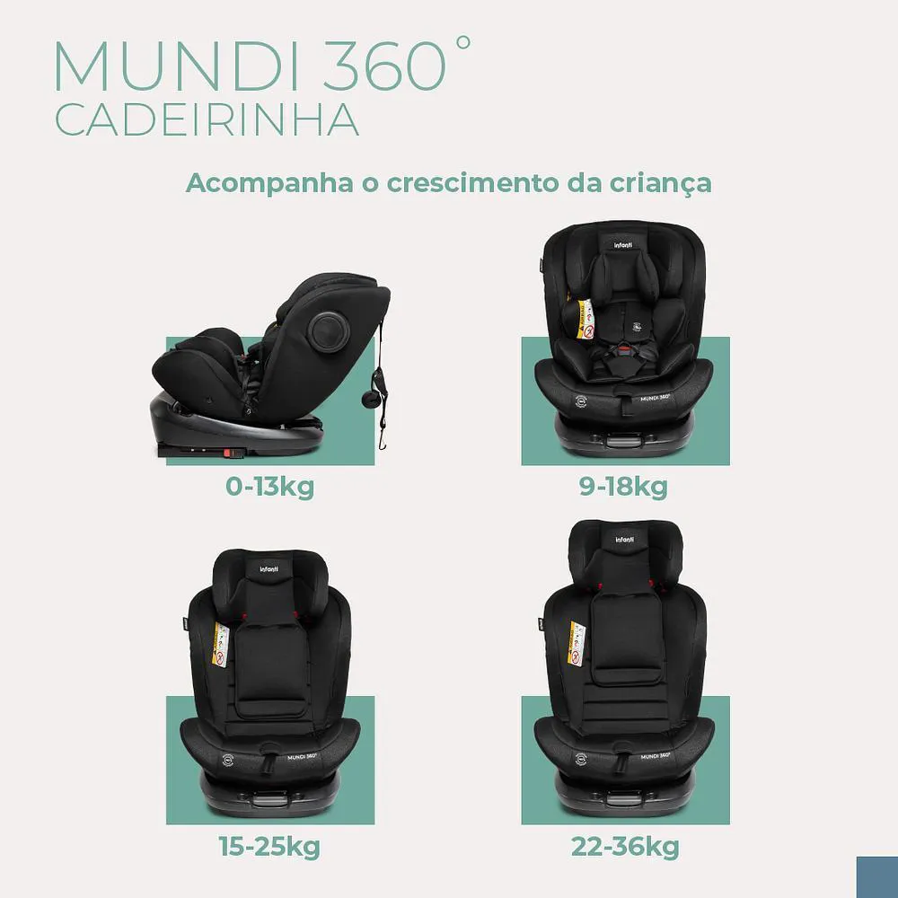 Explore um mundo de conforto e segurança com a Cadeirinha de Carro Mundi Isofix 360º da Infanti, uma solução completa que acompanha o crescimento do seu filho desde o nascimento até os 36 kg. Equipada com a tecnologia ISOFIX e recursos práticos como a rotação de 360°, esta cadeirinha é projetada para facilitar cada viagem, proporcionando tranquilidade e segurança máxima.BRBRCaracterísticas:BR•Instalação ISOFIX e Top Tether: Garante uma instalação rápida, fácil e segura, minimizando erros e aumentando a estabilidade.BR•Rotação 360°: Permite girar a cadeira para a porta, facilitando a colocação e retirada do seu filho sem esforço e com segurança.BR•Inclinação Ideal para Recém-Nascidos: Equipada com almofadas redutoras e super inclinação, oferece o máximo de conforto e ergonomia para os menores.BR•Longa Durabilidade: Aprovada para uso desde o nascimento até os 36 kg, com ajustes que acompanham o crescimento da criança.BR•Ajuste Prático de Cabeça e Cintos: Possibilita ajustar a altura do apoio de cabeça e do cinto de segurança simultaneamente, sem necessidade de desmontar partes da cadeirinha.BR•Armazenamento Inteligente de Cintos: Os cintos podem ser guardados na própria estrutura quando não são necessários, simplificando a transição para o uso dos cintos do veículo nos Grupos 2 e 3.BRBRA Cadeirinha de Carro Mundi Isofix 360º da Infanti é uma escolha excepcional para pais que valorizam a segurança, conforto e praticidade. Sua rotação de 360°, juntamente com a fácil instalação ISOFIX, oferece não apenas conforto ergonômico para os mais pequenos, mas também uma tranquilidade incomparável para os pais em todas as fases do crescimento de seus filhos. De recém-nascidos a pré-escolares, esta cadeirinha se adapta para oferecer a proteção e o conforto que seu filho merece em cada viagem.
