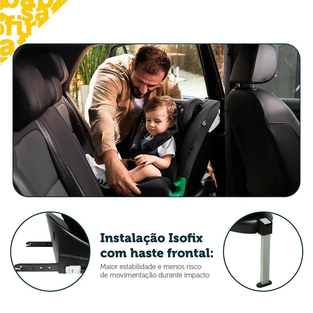 • Instalação Isofix com haste frontal: sistema que garante fixação firme, reduz deslocamentos e aumenta a estabilidade durante impactos.