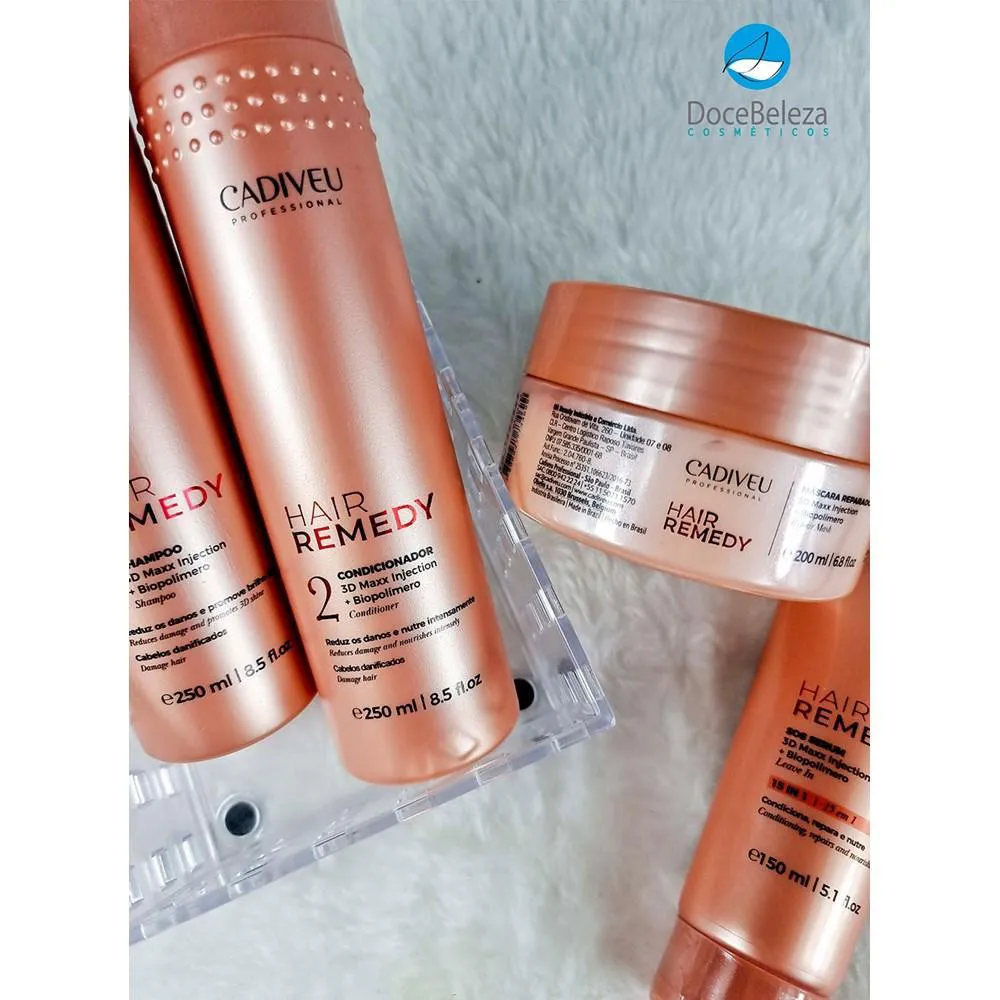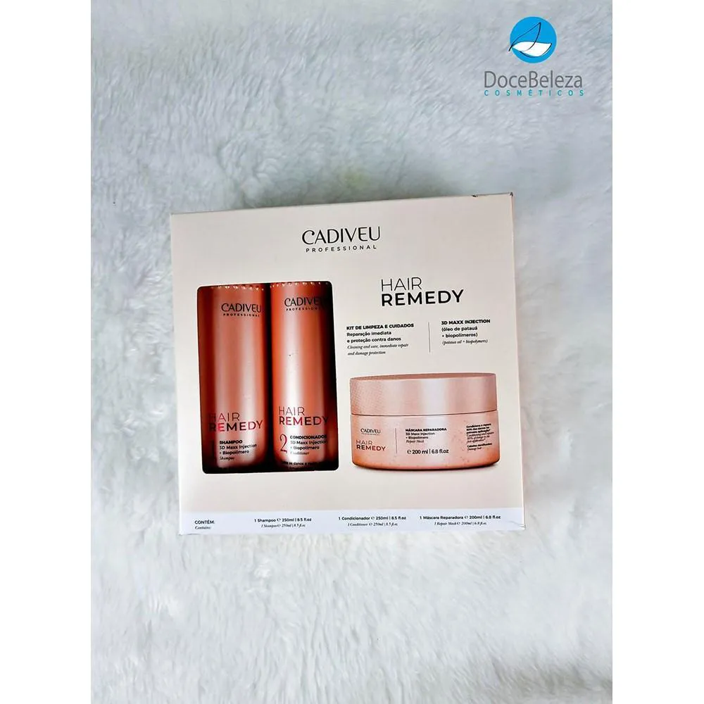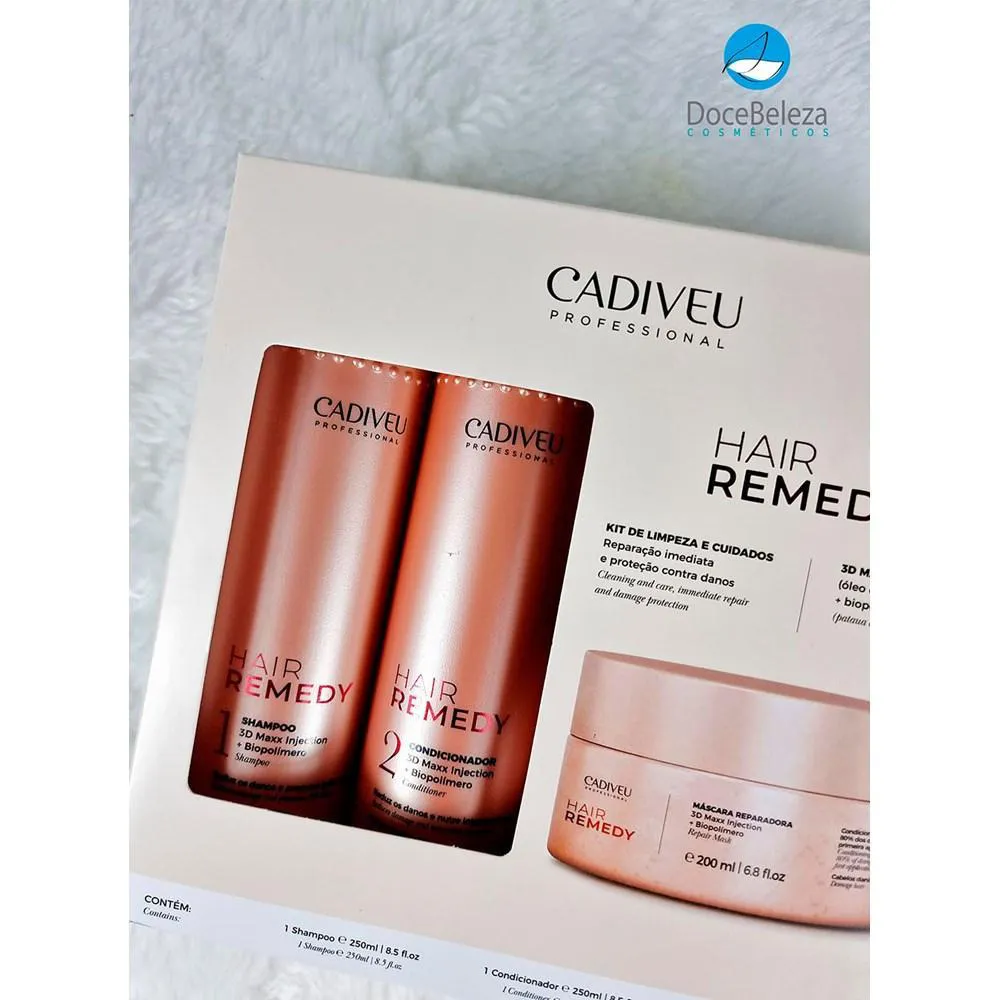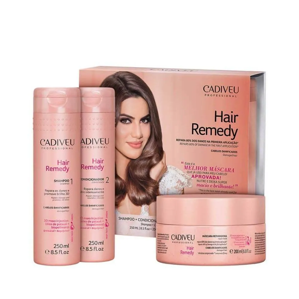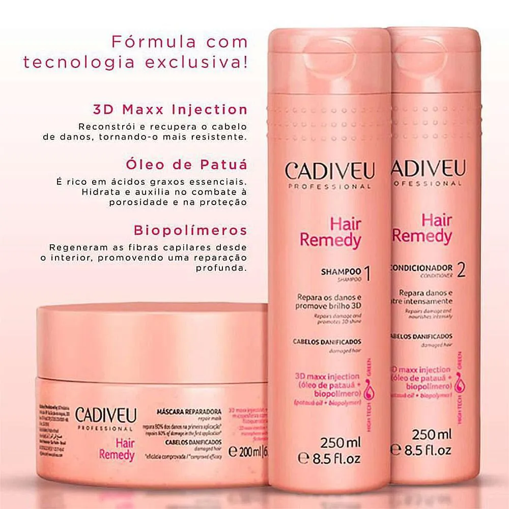 Cadiveu Hair Remedy Kit Trio Pequeno Kit Cadiveu de tratamento completo para cabelos danificados. Cadiveu Professional Hair Remedy Reparador limpa, desembaraça e condiciona os fios ao mesmo tempo em que repara os danos sofridos. Ele age devolvendo os nutrientes essenciais para que fiquem saudáveis. Sua formula rica ajuda a recuperar as fibras capilares dos danos sofridos. O Kit Cadiveu Professional Hair Remedy Reparador possui ingredientes reconstrutores que agem desde o interior dos fios, gradativamente e por tempo prolongado. Além disso, ele proporciona um brilho tridimensional saudável. Você percebe a melhora desde a primeira aplicação. Forma uma camada protetora ao redor das fibras, enquanto seu poder hidratante garante maciez e brilho. Seu cabelo fica limpo, desembaraçado, condicionado e saudável, com reparação dos danos, maciez e brilho. Contém: Cadiveu Professional Hair Remedy - shampoo 250ml: Shampoo para cabelos danificados. Limpa enquanto repara os fios que sofreram danos. Ele possui uma fórmula rica que devolve a vitalidade às fibras capilares. Cadiveu Professional Hair Remedy - condicionador 250ml: Condicionador para cabelos danificados. Desembaraça e condiciona os fios devolvendo os nutrientes essenciais para que fiquem saudáveis. Sua formula rica ajuda a recuperar as fibras capilares dos danos sofridos. Cadiveu Professional Hair Remedy Reparadora - máscara 200ml: Máscara de tratamento para cabelos danificados. Trata os fios para que se os danos sofridos sejam totalmente recuperados. Sua fórmula rica e nutritiva possui ativos poderosos que reconstroem as fibras capilares. Ação: 3D Maxx Injection: tecnologia exclusiva que recupera o cabelo de danos, tornando-o mais resistente. Ela age na reconstrução desde o interior dos fios, garantindo saúde e beleza. Óleo de Patuá: originário da palmeira da Amazônia, é rico em ácidos graxos essenciais. Ele hidrata, restaurando a maciez dos fios, além de ajudar no combate à porosidade e na proteção Biopolímeros: regeneram as fibras capilares desde o interior, promovendo uma reparação profunda. Conselho de Aplicação: Aplique o shampoo sobre os fios úmidos. Massageie gentilmente e em seguida, enxágue. Espalhe a máscara sobre os fios limpos e úmidos. Deixe agir de 5 a 10 minutos e enxágue. Então, distribua o condicionador sobre o cabelo limpo e úmido. Deixe agir por alguns instante para então, enxaguar. Resultado: Seu cabelo fica limpo, desembaraçado, condicionado e saudável, com reparação dos danos, maciez e brilho.