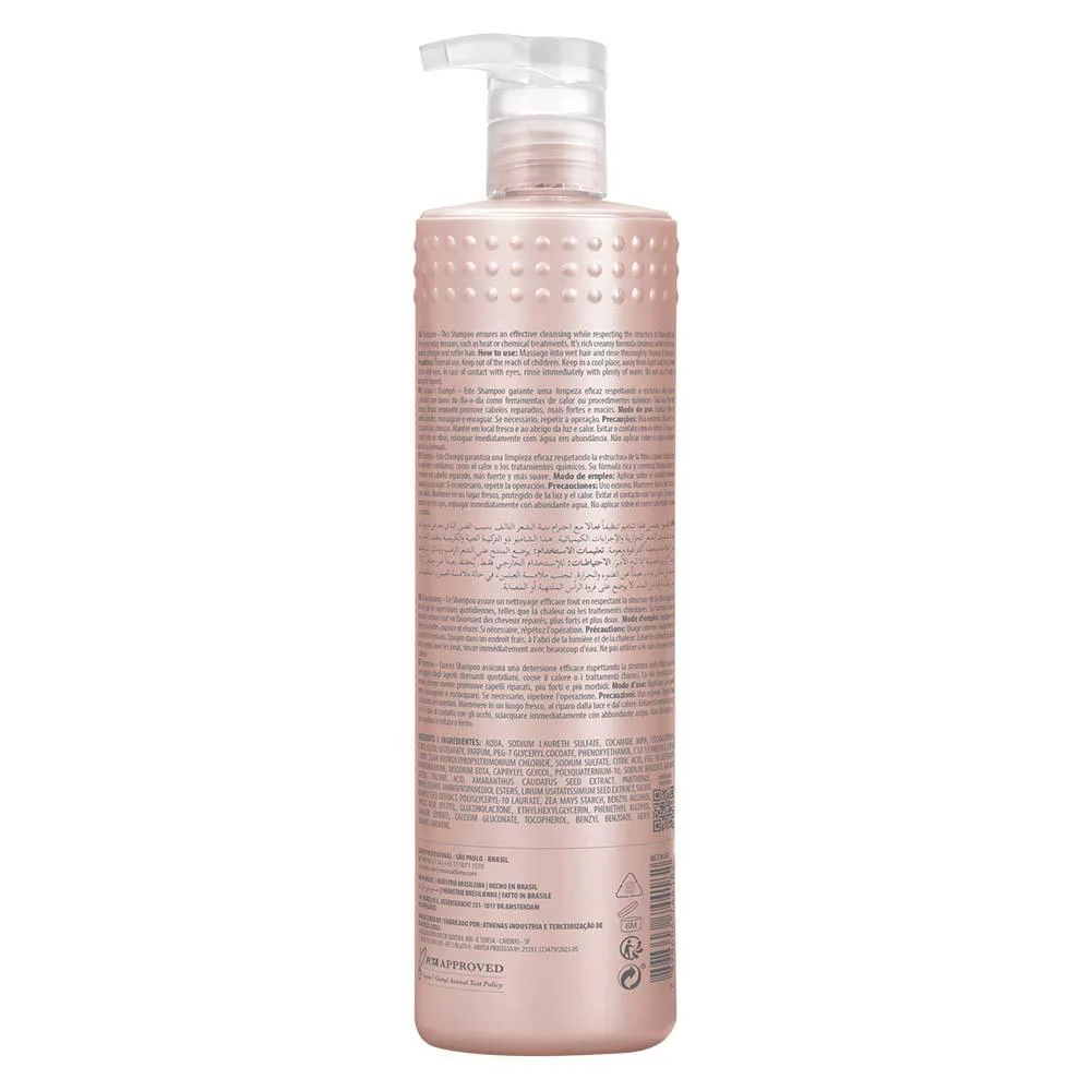 O uso deste tratamento é recomendado sempre que o seu cabelo estiver fraco, quebradiço e danificado. Este shampoo garante uma limpeza eficaz respeitando a estrutura dos cabelos danificados por danos do dia-a-dia como ferramentas de calor ou procedimentos químicos. Sua rica fórmula cremosa, limpa enquanto promove cabelos reparados, mais fortes e macios. Nossas fórmulas de alta performance são livres de crueldade animal, e 100% veganas com ativos naturais em uma composição responsável e gentil para o planeta.