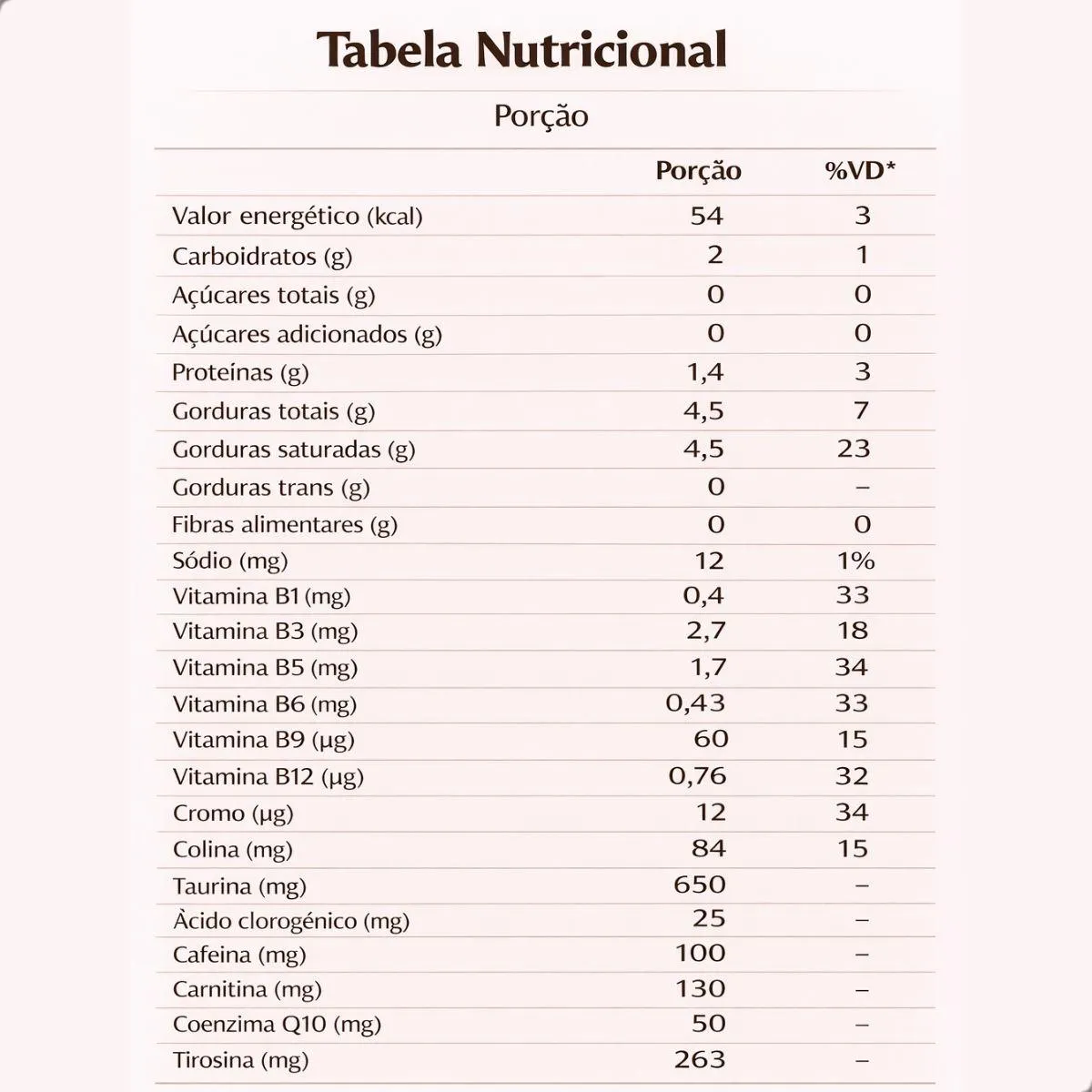 - Composição com ingredientes de alta qualidade, incluindo Café Arábica, Taurina, Coenzima Q10 e L-Carnitina.