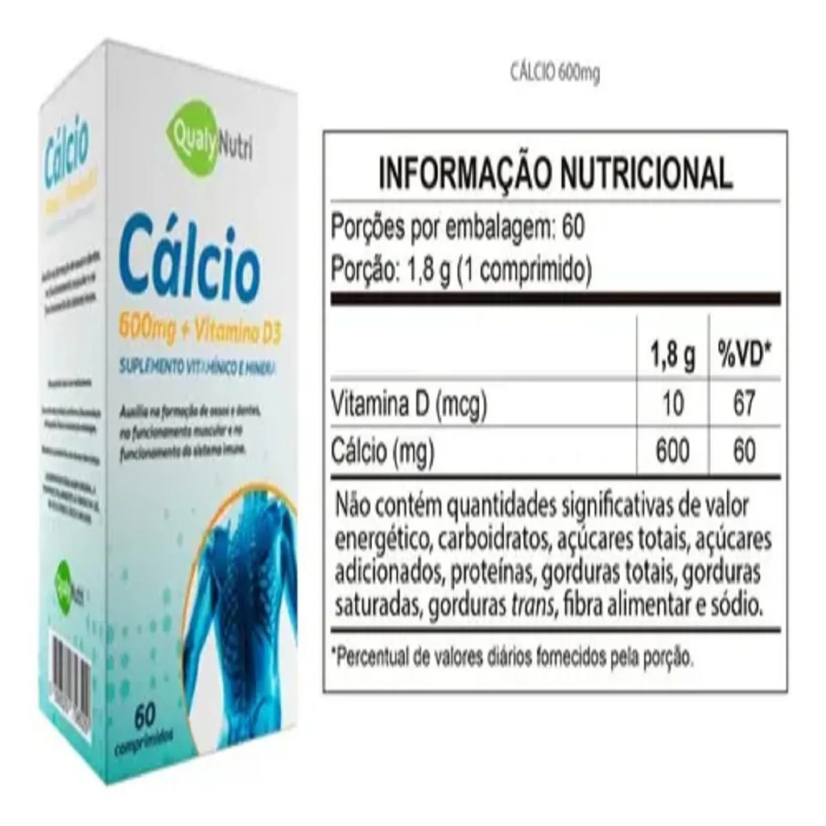 Cálcio 600mg + vitamina D3 Com 60 Comprimidos - Qualynutri