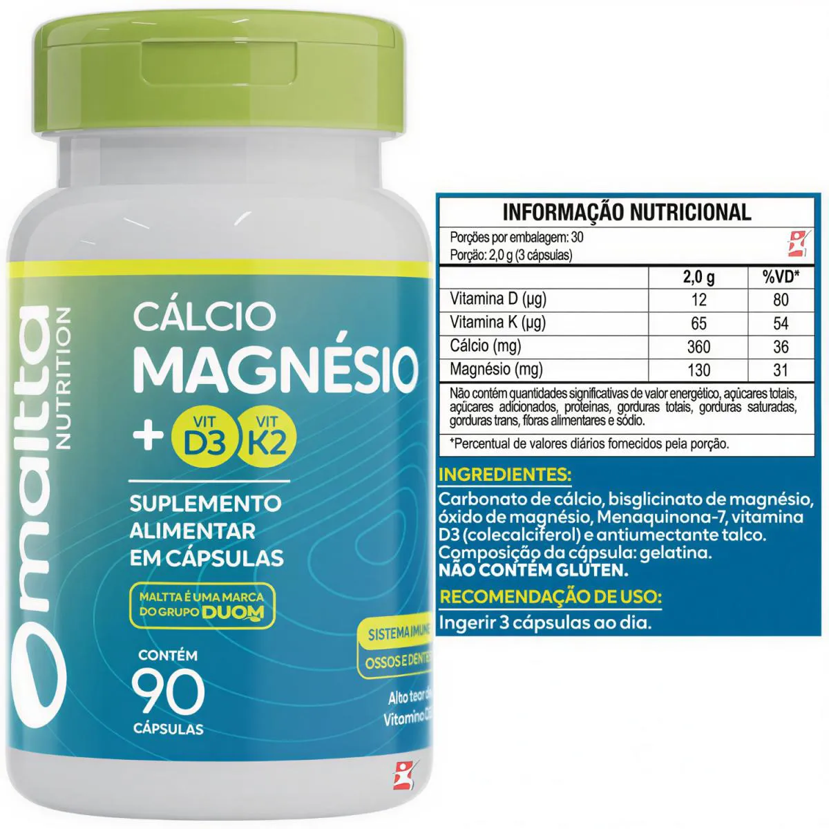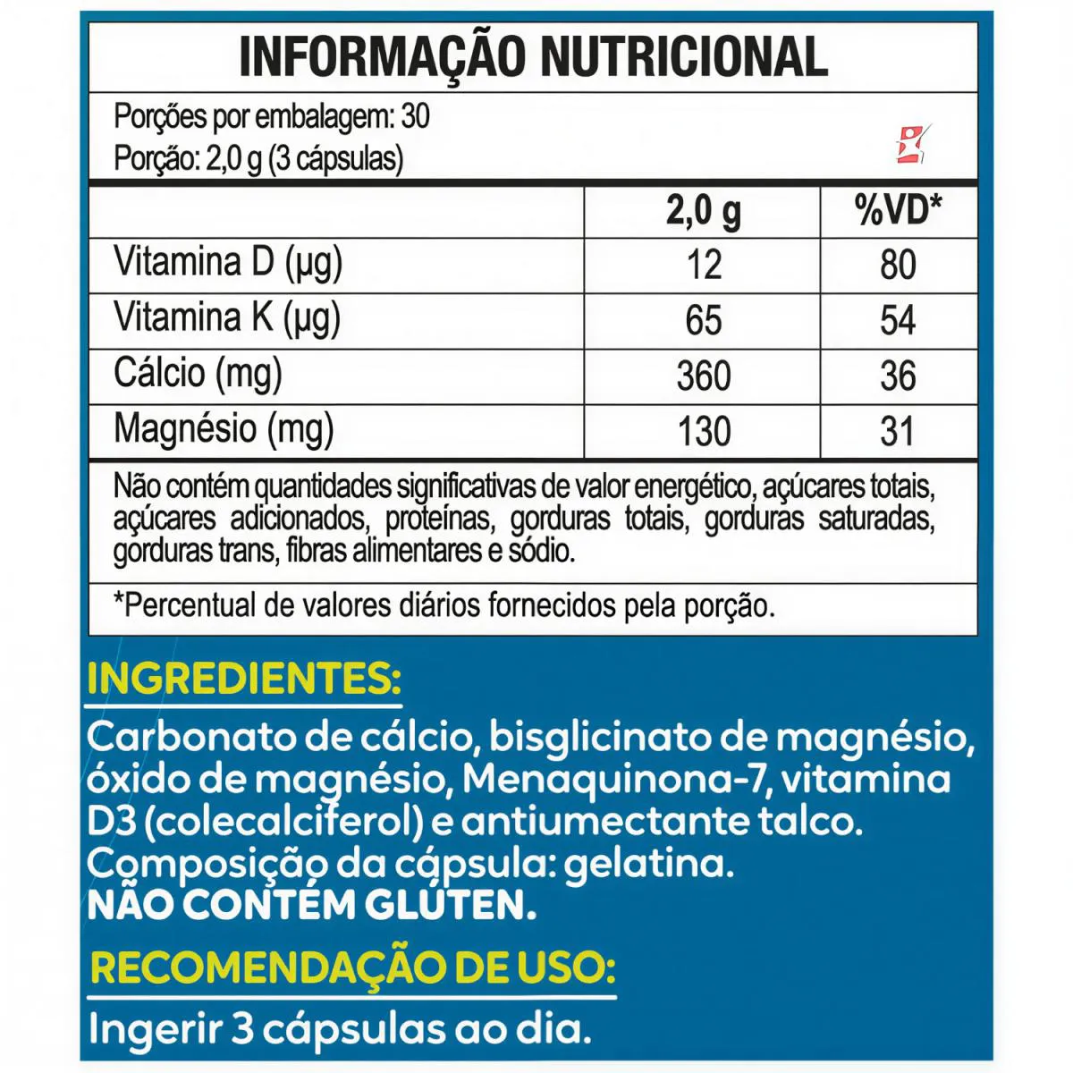 — composição — INDÚSTRIA DO CORPOCarbonato de Cálcio, Bisglicinato de Magnésio, Vitamina K2 (Menaquinona-7-MK7), Vitamina D3 (Colecalciferol) e Antiumectante Silicato de Magnésio.Composição da Cápsula: Gelatina, Água e Corantes Azul Brilhante, Vermelho 40 e Amarelo de Quinolina.
