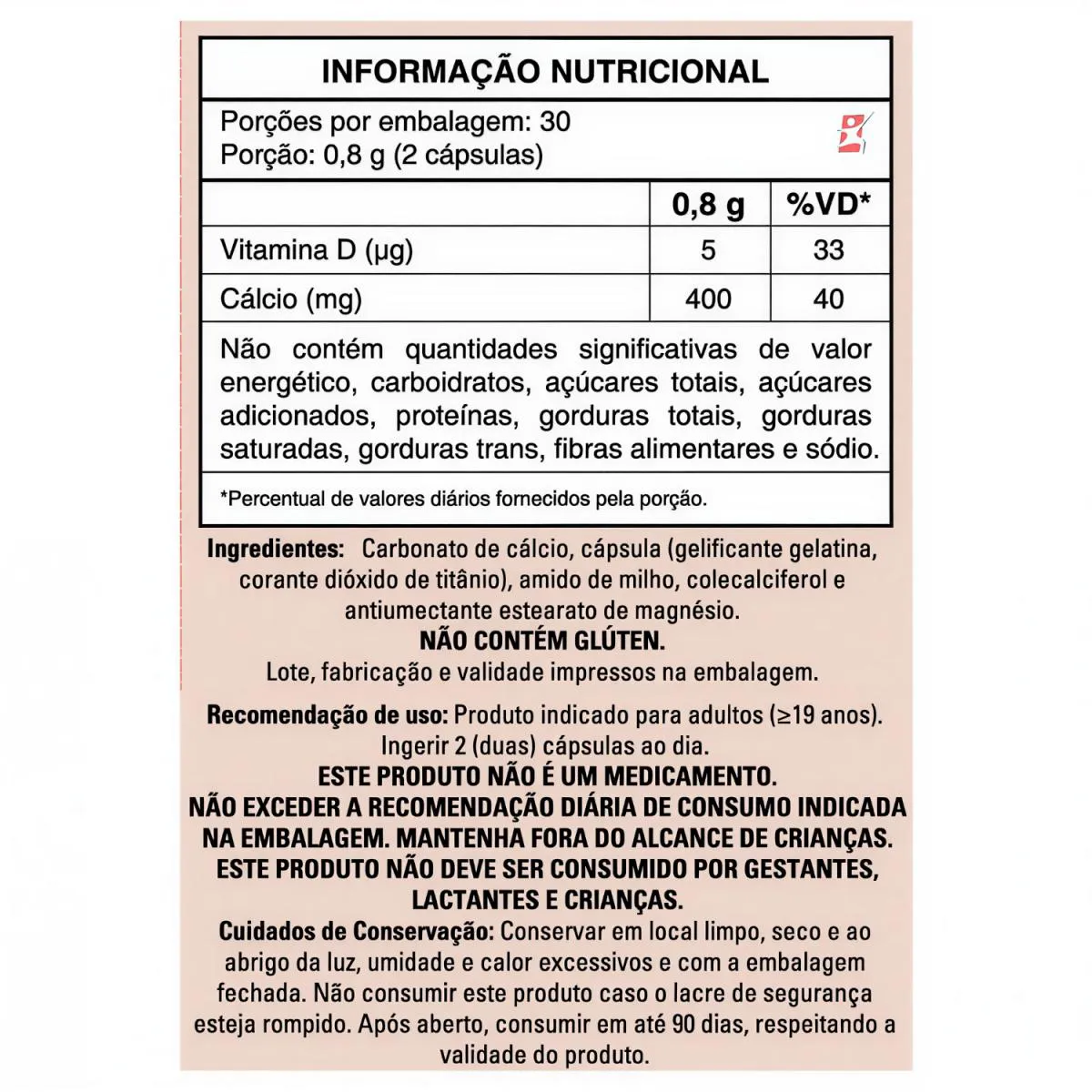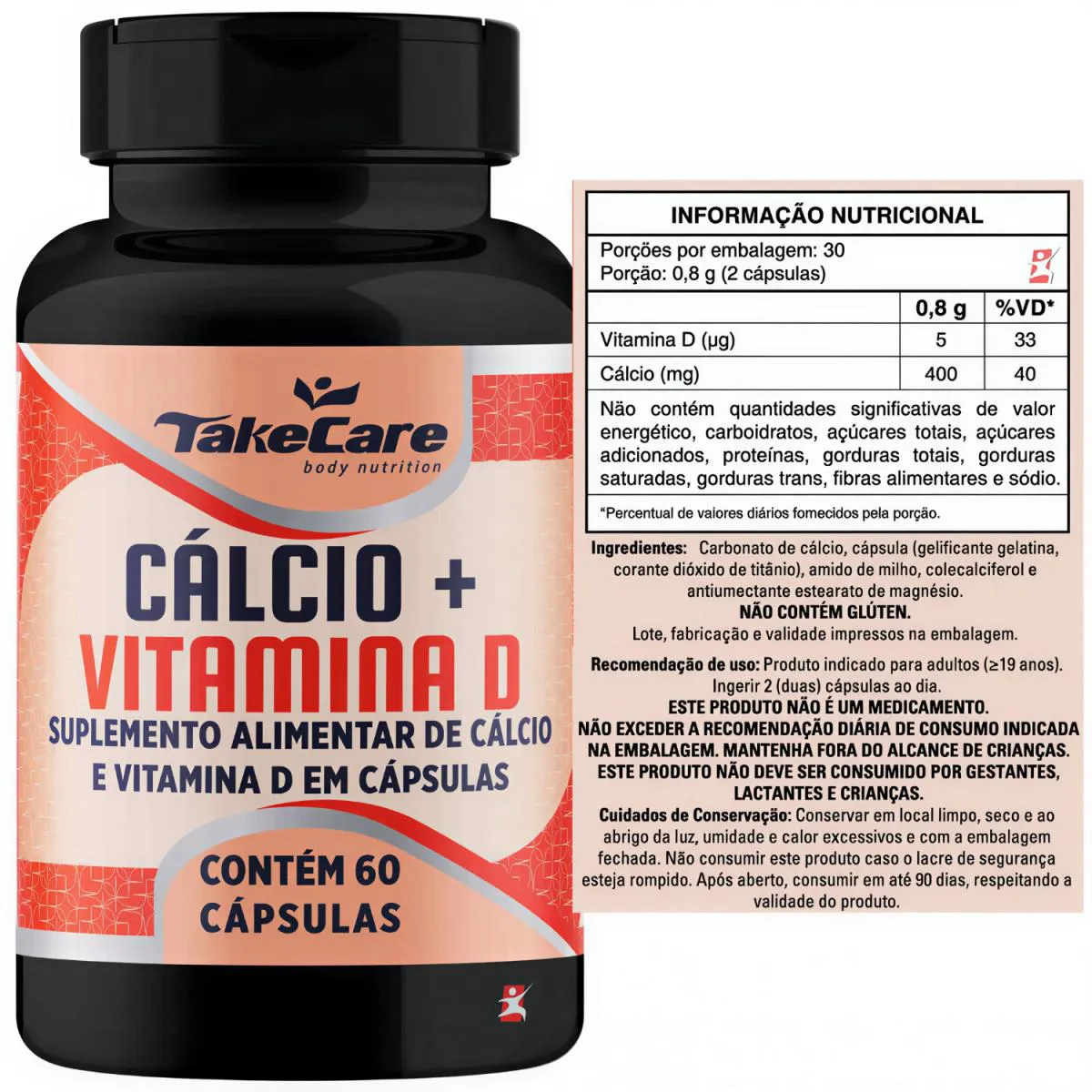 CÁLCIO + vitamina D 60 CÁPSULAS – TAKE CARE DESCRIÇÃO É um suplemento alimentar em cápsulas a base de cálcio e vitamina d. Cálcio: mineral essencial para a construção e manutenção dos ossos e dos dentes, coagulação sanguínea, ativação de enzimas, condução de impulsos nervosos e contração muscular. Vitamina D: conhecida como a vitamina do sol, é muito importante para o corpo humano. Além de suas funções mais conhecidas relacionadas à saúde dos ossos, é responsável também por outras atividades, trabalhando como reguladora do crescimento, sistema imunológico, cardiovascular, muscular, metabolismo e insulina. BENEFÍCIOS - Apenas 2 cápsulas ao dia;