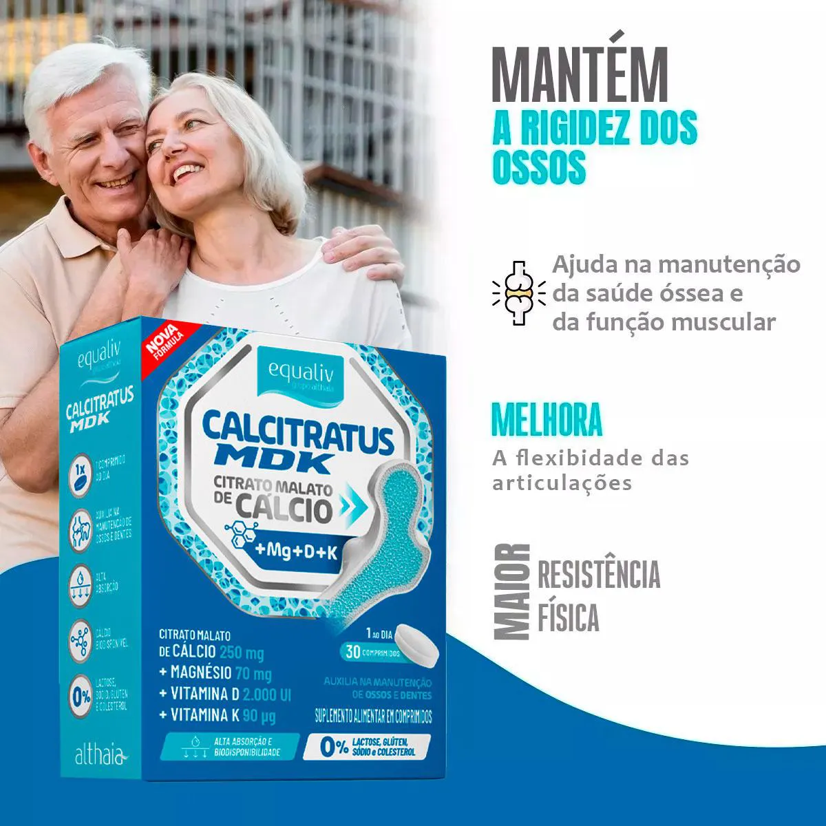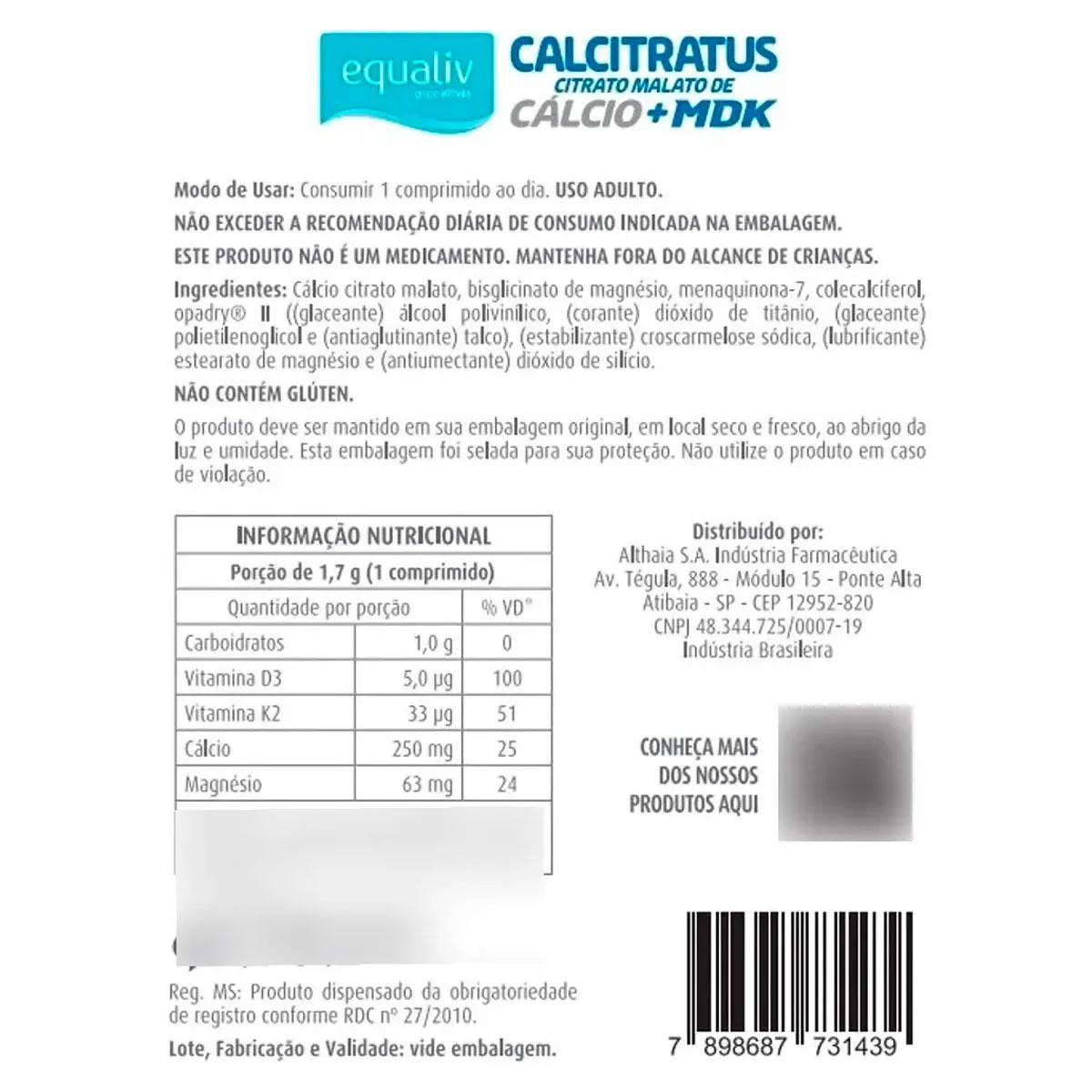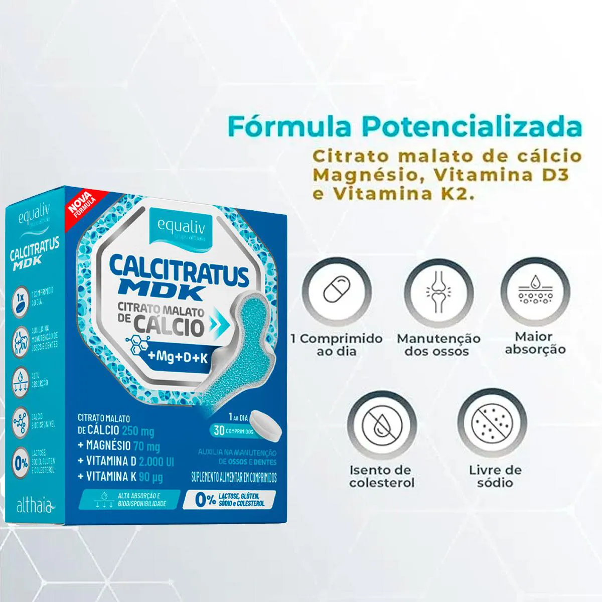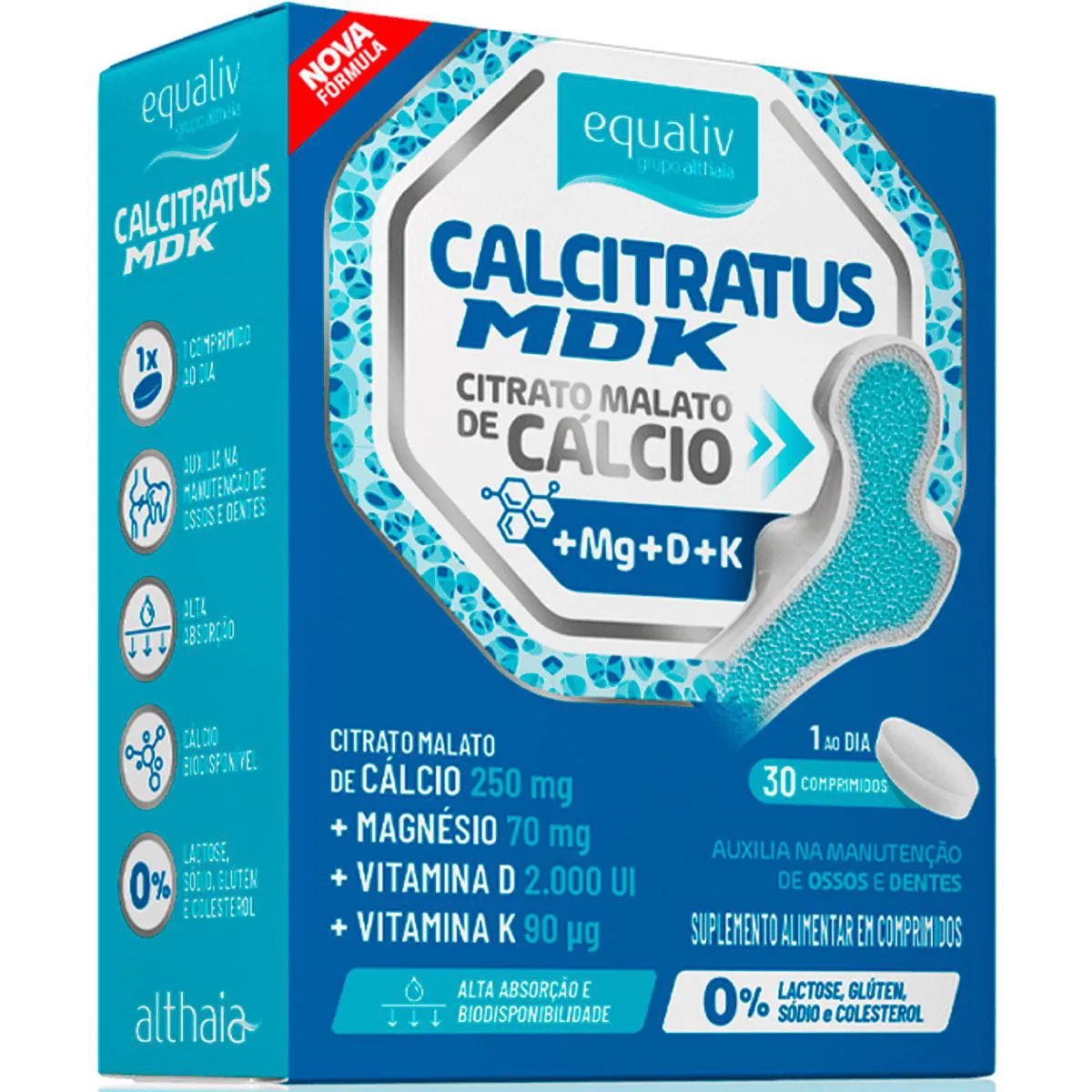 O cálcio é o mineral mais abundante do corpo humano e o que precisa ser ingerido em maiores quantidades. Além da sua importância para os ossos e dentes, o cálcio participa do funcionamento muscular, auxilia no processo de divisão celular e no metabolismo energético. Você sabia que estatísticas apontam que grande parte da população não ingere o suficiente deste mineral vital? Outro fator importante é que suplementar cálcio isoladamente não é uma maneira efetiva de suprir as necessidades do corpo. Para mantermos a saúde óssea em dia, outros três nutrientes vitais, as vitaminas D3, magnésio e vitamina K2, são necessários. Assim como acontece com o cálcio, estes três nutrientes essenciais costumam faltar na dieta e estilo de vida modernos. O Calcitratus+MDK é um suplemento natural, formulado especialmente para a saúde dos ossos e dentes. A Equaliv pensando em fornecer o mais completo suplemento alimentar para sua qualidade de vida, traz a associação citrato malato (sal) + cálcio (mineral), formando o citrato malato de cálcio, potencializando ainda mais os seus efeitos, ideal para suprir o seu organismo deste elemento indispensável! Citrato malato de cálcio, vitamina d, vitamina K2 e magnésio. Formulação ideal para garantir a biodisponibilidade e absorção do cálcio adequadamente e de forma eficaz. Qual a quantidade de cálcio elementar e vitamina D por dose? Contém 250mg de cálcio elementar e 2.000UI de vitamina D (concentração expressa na tabela nutricional), por porção - 1 comprimido. O produto contém açúcar, lactose, glúten ou alergênicos? Não contém açúcar e é livre de alergênicos como glúten, leite ou derivados. Existe melhor horário para consumo? Recomendamos o consumo de 1 comprimido ao dia no horário que melhor se encaixar em sua rotina ou conforme orientação do profissional da saúde. Advertências: "ESTE PRODUTO NÃO É UM MEDICAMENTO" "ESTE PRODUTO É UM SUPLEMENTO ALIMENTAR" "MANTENHA FORA DO ALCANCE DE CRIANÇAS" "NÃO EXCEDER A RECOMENDAÇÃO DIÁRIA DE CONSUMO INDICADA NA EMBALAGEM" Registro no M.S. nº Produto dispensado de registro RDC 240 de 2018