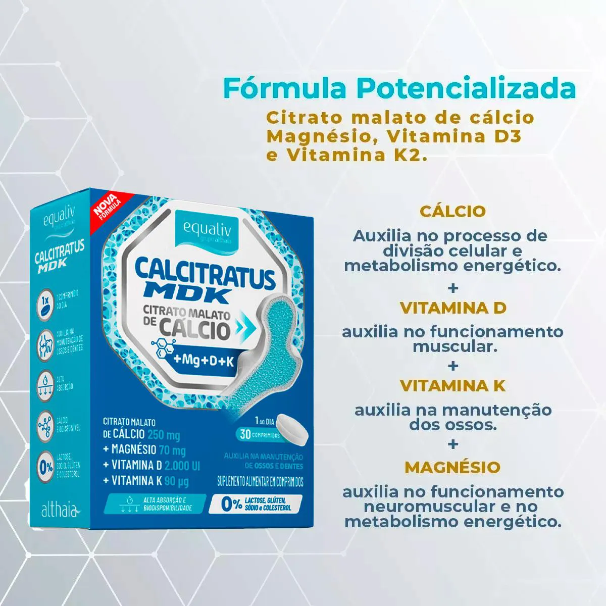 - Contém cálcio, vitaminas D3, K2 e magnésio.