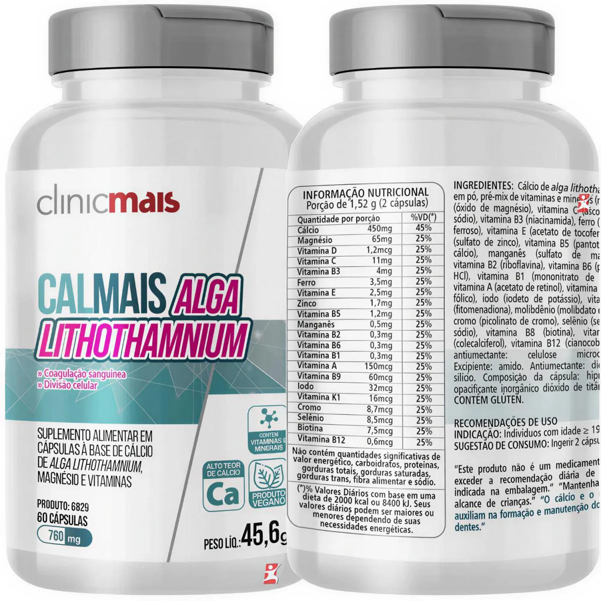 CALMAIS ALGA LITHOTHAMNIUM CÁLCIO VEGETAL + VITAMINAS + minerais 60 CÁPSULAS - CLINICMAIS O QUE É O CALMAIS ALGA LITHOTHAMNIUM? O Calmais Alga Lithothamnium é um suplemento alimentar em cápsulas, desenvolvido com uma poderosa combinação de cálcio de origem vegetal, extraído da alga Lithothamnium, além de magnésio e um complexo de vitaminas e minerais fundamentais para a saúde dos ossos, dentes, músculos e muito mais. Sua fórmula é ideal para quem busca um aporte nutricional equilibrado, especialmente em dietas com baixo consumo de cálcio ou em momentos da vida que exigem maior cuidado com a saúde óssea. INGREDIENTES DO CALMAIS ALGA LITHOTHAMNIUM - Cálcio da alga Lithothamnium – Fonte vegetal altamente biodisponível, rica em minerais essenciais. - Magnésio – Nutriente essencial para a absorção do cálcio e funcionamento muscular. - vitamina D – Auxilia na absorção e fixação do cálcio nos ossos. - vitamina c – Contribui para a manutenção da imunidade e saúde dos ossos. - Vitaminas do complexo B – Envolvidas no metabolismo energético e saúde celular. - Vitamina K1 – Atua na fixação do cálcio nos ossos e na coagulação sanguínea. - Zinco, Cobre, Selênio, Ferro, Manganês, Cromo e Molibdênio – Minerais essenciais para o equilíbrio do organismo. A combinação desses ingredientes potencializa a absorção do cálcio, promovendo maior aproveitamento pelo organismo e garantindo um suporte nutricional mais completo. O QUE DIZEM OS CONSUMIDORES? Pesquisas em fóruns indicam que muitas pessoas buscam o cálcio de alga Lithothamnium por ser vegano e mais biodisponível do que outras fontes de cálcio. Além disso, consumidores relatam que escolhem esse tipo de suplemento para evitar derivados de leite e fontes sintéticas, garantindo um aporte mais natural de cálcio e minerais. O QUE DIZEM OS ESTUDOS? Estudos apontam que o cálcio derivado da alga Lithothamnium possui uma alta taxa de absorção em comparação com o carbonato de cálcio tradicional. Além disso, sua composição natural oferece um mix de mais de 70 minerais essenciais, tornando-o uma opção diferenciada no mercado. O CALMAIS ALGA LITHOTHAMNIUM POSSUI CONTRAINDICAÇÕES? Pessoas com hipersensibilidade a algum dos componentes da fórmula devem evitar o consumo. Gestantes, lactantes e indivíduos com condições médicas específicas devem consultar um profissional de saúde antes de utilizar o produto. O CALMAIS ALGA LITHOTHAMNIUM É VEGANO? Sim. O cálcio presente no produto é extraído exclusivamente da alga Lithothamnium, uma fonte vegetal. Além disso, não há ingredientes de origem animal na composição. QUAL A FORMA CORRETA DE USO DO CALMAIS ALGA LITHOTHAMNIUM? - Quantidade diária recomendada: Ingerir 2 cápsulas ao dia. - Horário ideal de consumo: Preferencialmente junto às refeições principais. - Indicação: recomendado para indivíduos com idade ≥ 19 anos. CONSCIENTIZAÇÃO DO USO DO PRODUTO O consumo regular e contínuo do suplemento é fundamental para alcançar os benefícios desejados, assim como uma alimentação equilibrada e hábitos saudáveis. Lembre-se de que suplementos não substituem uma dieta variada. DICAS PARA POTENCIALIZAR OS RESULTADOS - Mantenha uma dieta rica em nutrientes que favoreçam a saúde óssea, como vegetais verdes e proteínas magras. - Pratique atividades físicas regularmente para fortalecer ossos e músculos. - Exponha-se ao sol de forma moderada para estimular a produção natural de vitamina d e potencializar a absorção de cálcio. O CALMAIS ALGA LITHOTHAMNIUM É REGULAMENTADO PELA ANVISA? Sim, este produto é dispensado de registro conforme a RDC 240/2018 da ANVISA. AVISO IMPORTANTE - Este produto não é um medicamento. - Não exceda a recomendação diária de consumo indicada na embalagem. - Mantenha fora do alcance de crianças. - Consulte um profissional de saúde antes de iniciar o consumo deste suplemento.