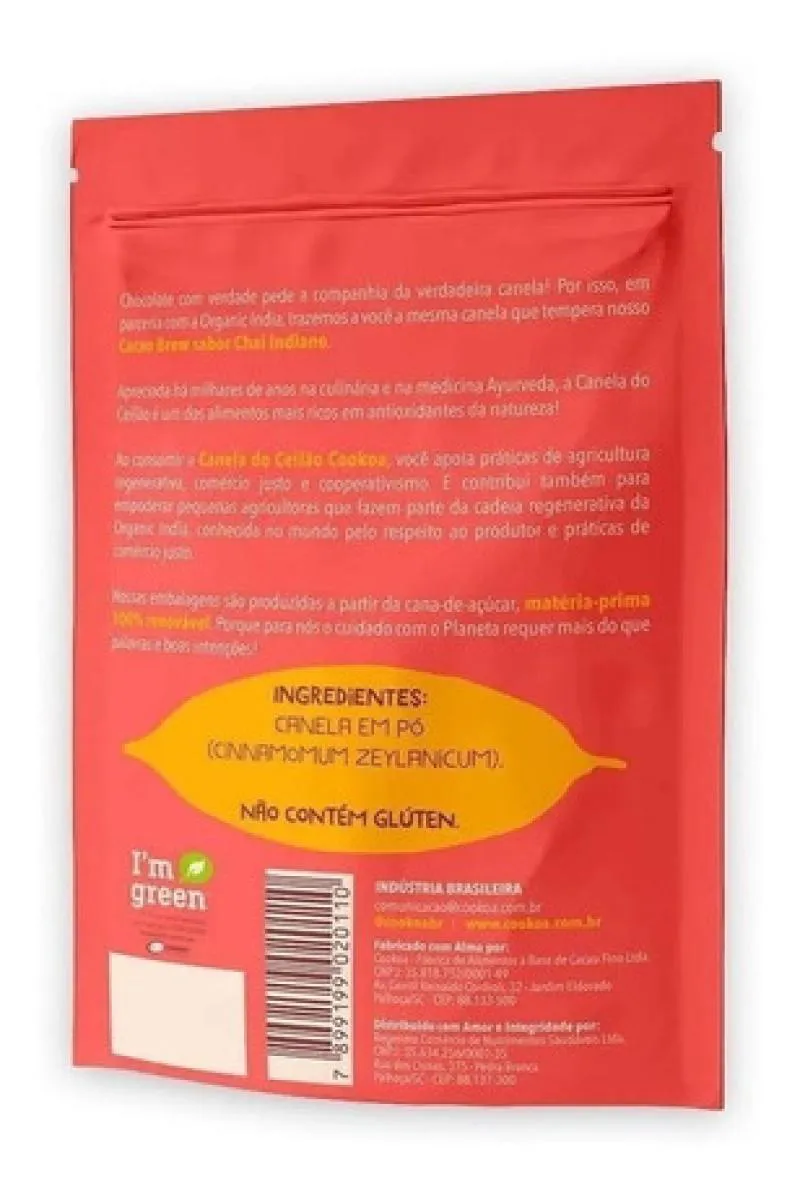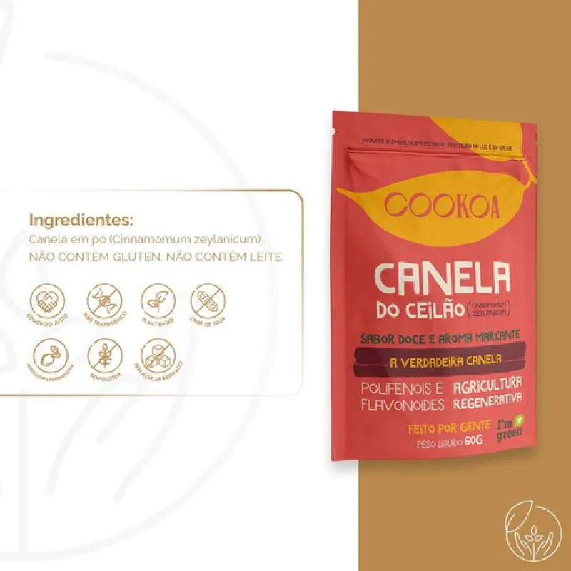 Apresentação: Produto: Canela do Ceilão Quantidade: 60 gramas Marca: Cookoa _____________ Descrição: Em parceria com a Organic India, a Cookoa traz para você a verdadeira canela! Apreciada há milhares de anos na culinária e medicina ayurveda, a Canela do Ceilão é um dos alimentos mais ricos em antioxidantes da natureza. Ao consumir a Canela do Ceilão Cookoa, você apoia práticas de agricultura regenerativa, comércio justo e cooperativismo. E contribui também para empoderar pequenas agricultoras que fazem parte da cadeia regenerativa da Organic India, conhecida no mundo pelo respeito ao produtor. _____________ Benefícios:
