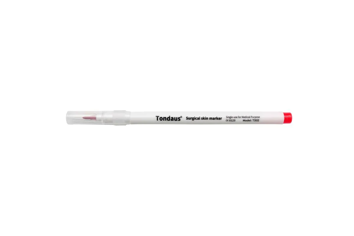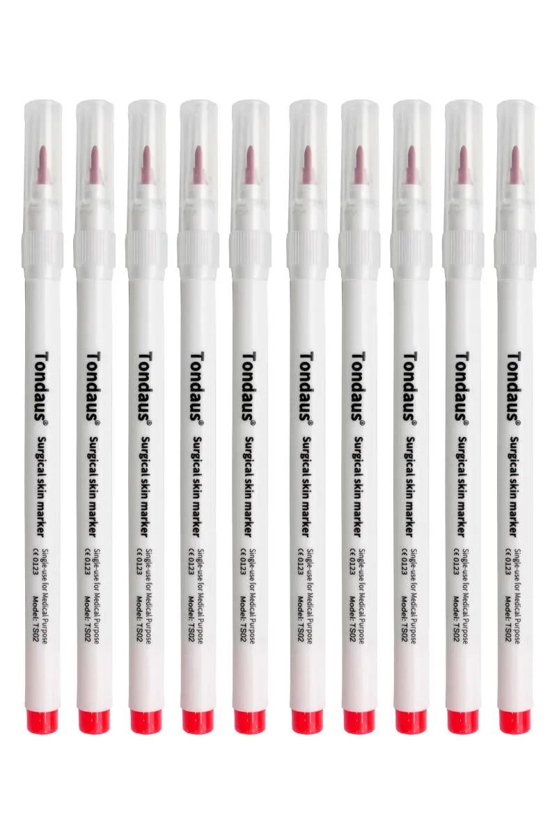 CANETA MARCADORA TONDAUS COR VERMELHA PONTA 1.0MM TS02 10UN A Caneta de Marcação Cirúrgica Tondaus é visível até 10 vezes mais do que a tinta tradicional, eliminando a necessidade de remarcar o paciente na sala de operação. Ideal para procedimentos ortopédicos, espinhais, microblanding, marcação de sobrancelhas, tatuagens, e cirurgias plásticas que requerem marcação extensiva, como elevadores de mama e abdominoplastia. Também é perfeita para lipoaspiração e outros procedimentos que utilizam preparações agressivas como CHG. Indicações: Procedimentos ortopédicos e espinhais, microblanding para marcar sobrancelhas e tatuagens, procedimentos de cirurgia plástica com marcação extensiva (ex: elevadores de mama, abdominoplastia), Lipoaspiração (tumescente). Características: