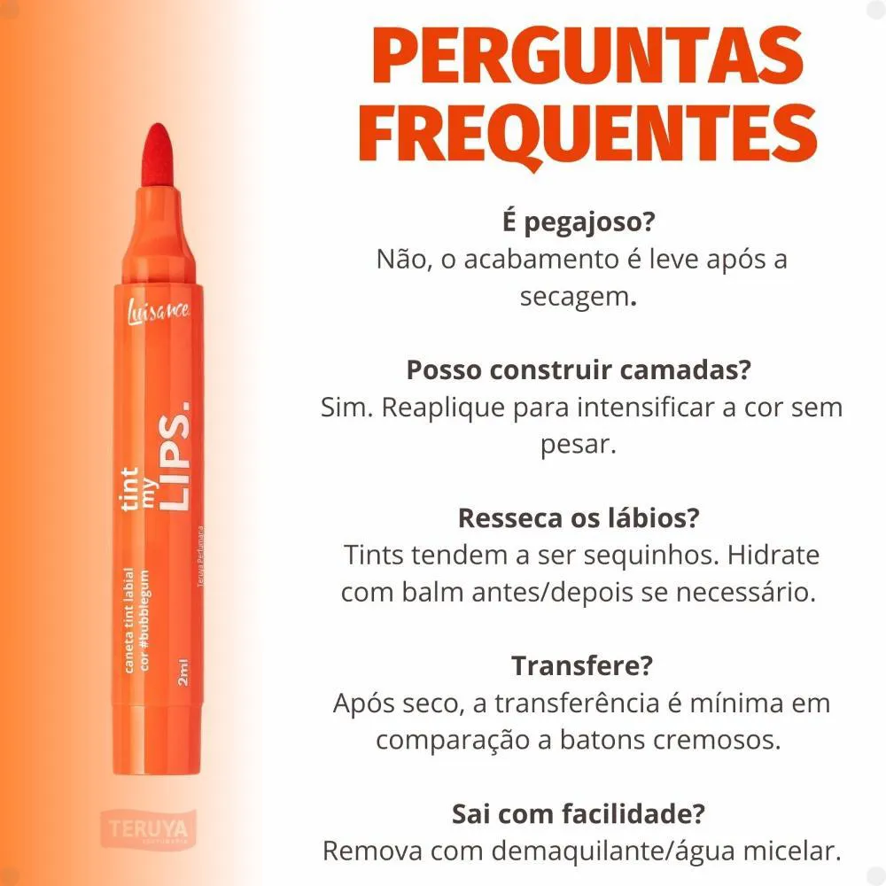 lábios. Este tint labial é a escolha perfeita para quem busca um toque de cor duradouro com a praticidade de uma caneta. Com sua fórmula vegana e cruelty-free, a Caneta Tint Labial Bubblegum não só realça sua