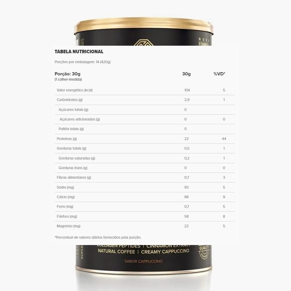 Um toque especial de canela e cacau deixa evidente a cremosidade e doçura do Cappuccino Whey. Uma combinação de whey protein Hidrolisado e Isolado com café, cacau e canela, além de colágeno hidrolisado em peptídeos, é uma ótima opção para inspirar suas atividades e seus sentidos.