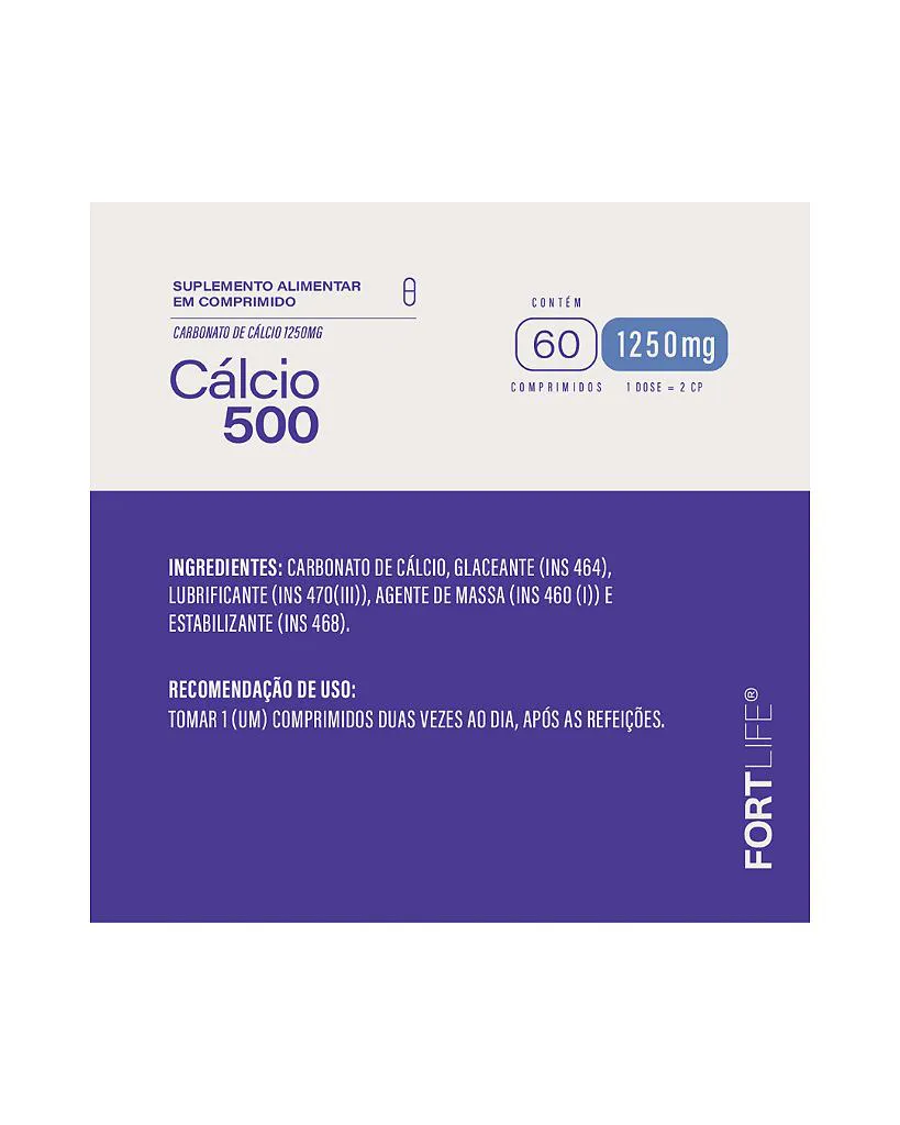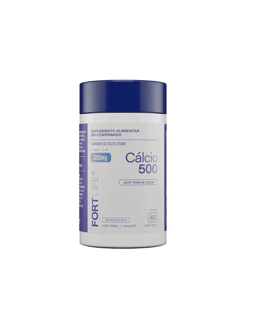 - O Cálcio 500 Fortlife é um suplemento alimentar formulado com Carbonato de Cálcio 1250mg, que fornece 500mg de cálcio elementar por dose, uma forma eficaz e amplamente utilizada para auxiliar na reposição adequada desse mineral essencial ao organismo. O cálcio não é importante apenas para ossos e dentes, mas também desempenha papel fundamental no funcionamento muscular, na transmissão dos impulsos nervosos, na coagulação sanguínea e na liberação de hormônios e enzimas. A suplementação adequada contribui para a manutenção da saúde ao longo de todas as fases da vida.