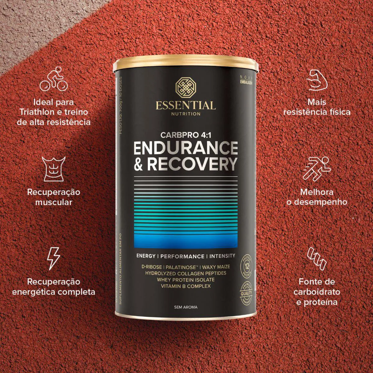 A fórmula reúne palatinose, maltodextrina, whey protein isolado e hidrolisado, aminoácidos e minerais, sem adição de açúcar, glúten, lactose ou corantes artificiais.