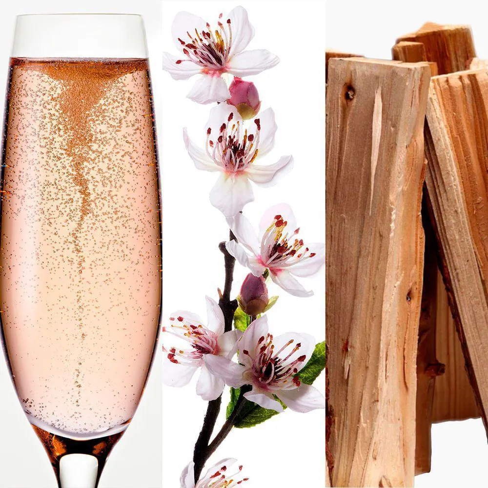 - Notas de champanhe rosé e flores delicadas.