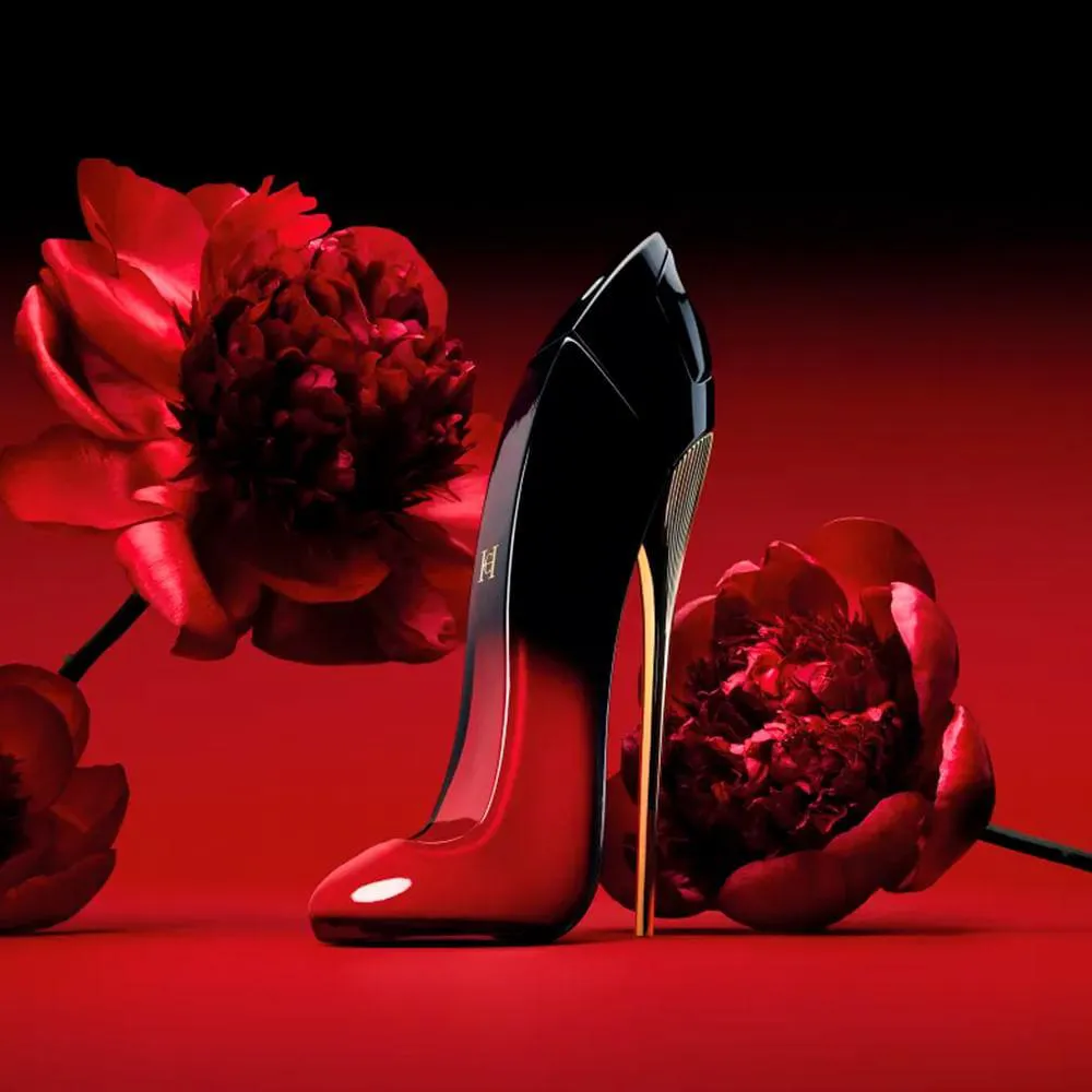 Design ou Praticidade: O frasco em forma de salto preto brilhante com detalhes dourados é um ícone de design, funcional e luxuoso, fácil de carregar e exibir como peça de decoração.