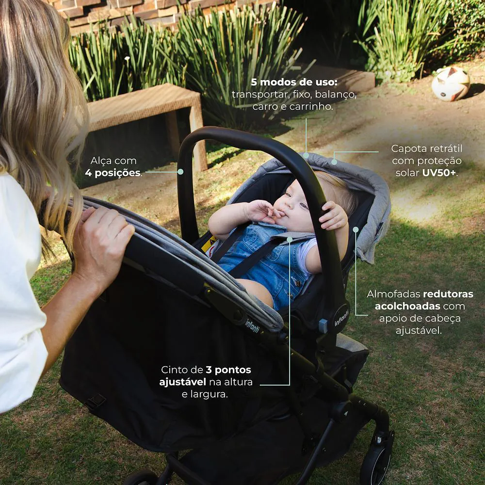 - Alça do bebê conforto com 4 posições e 5 modos de uso.