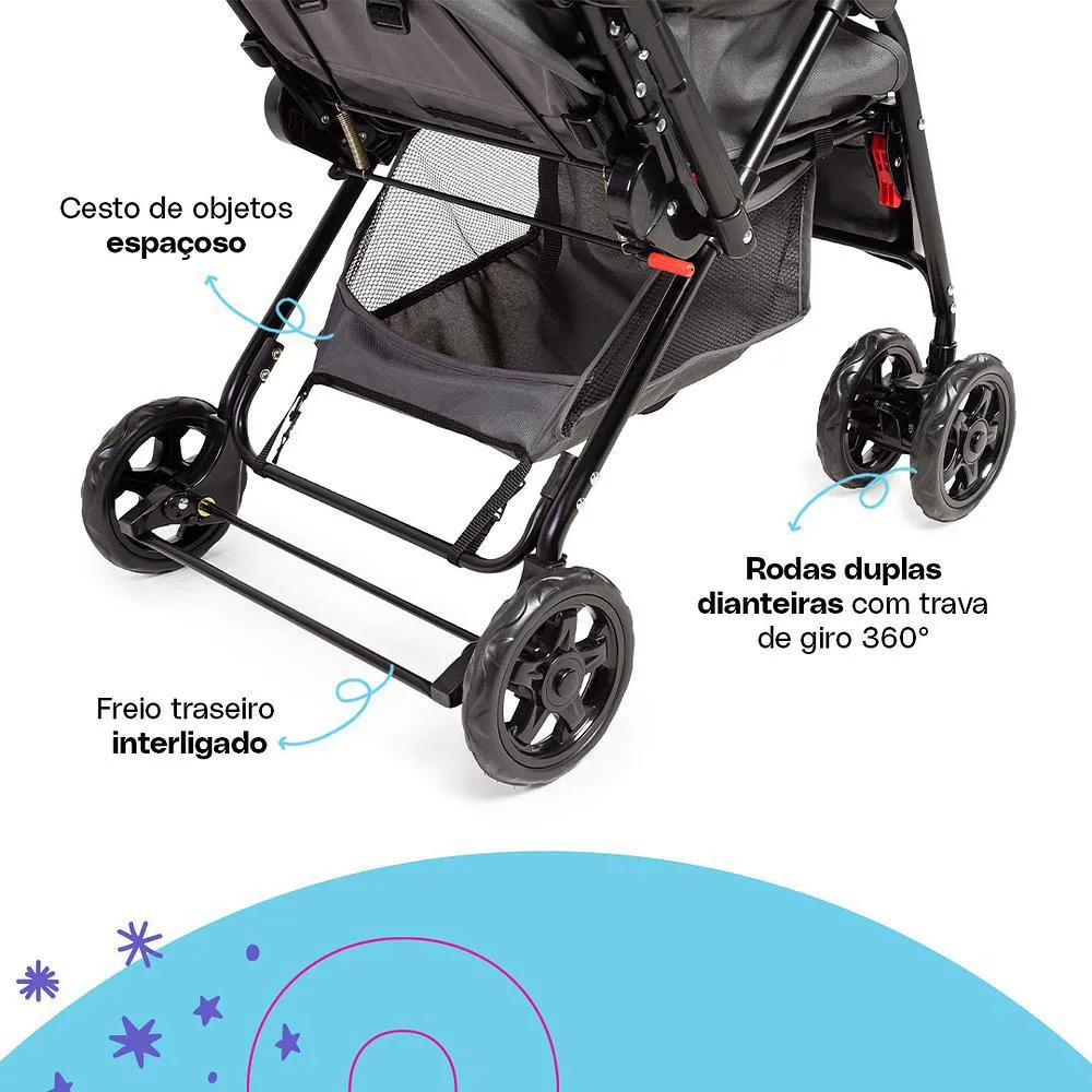 •Material: Ferro, Polipropileno, Poliuretano, Poliéster (carrinho); HDPE e Poliéster (bebê conforto)
