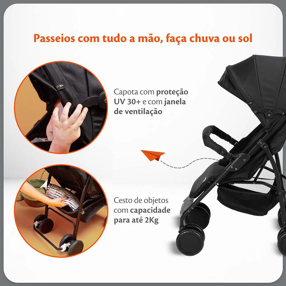 • Capota ampla: Com proteção solar UV30+ e janela de ventilação para maior conforto térmico.