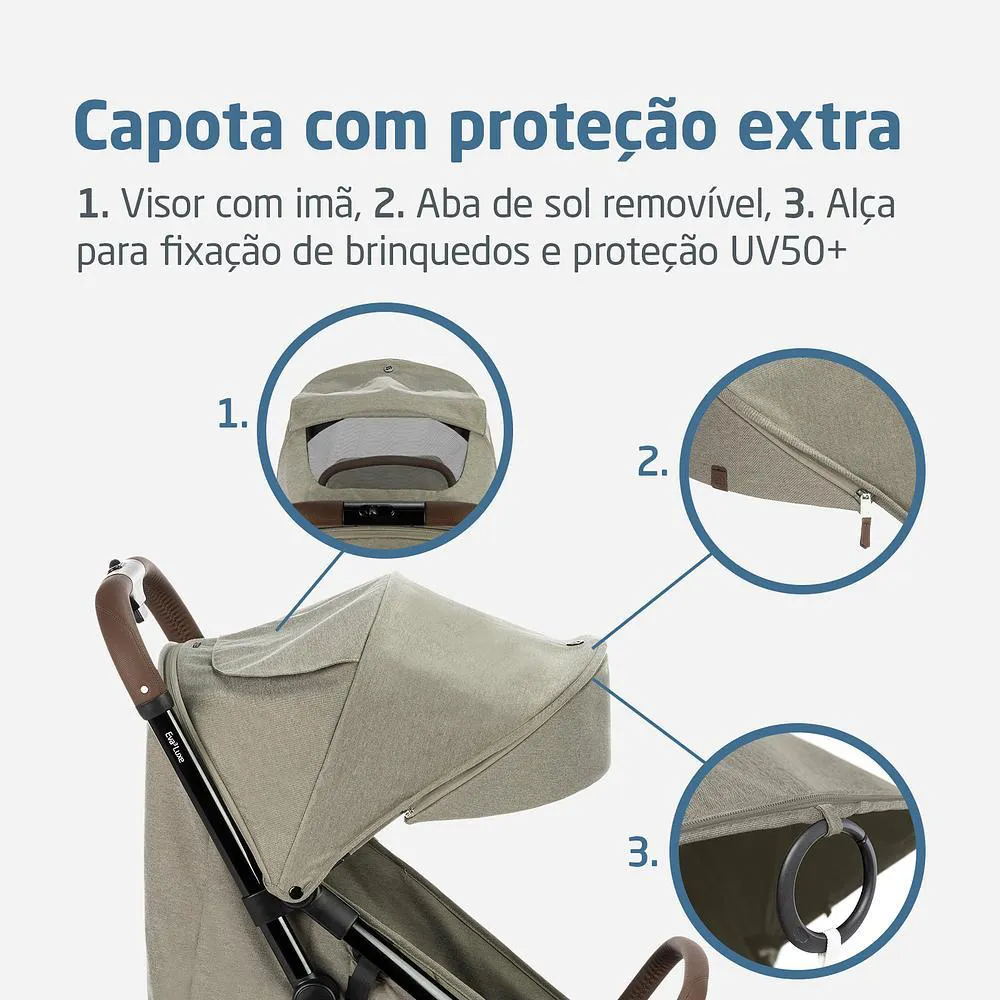 •Capota UV50+ com visor magnético e aba removível: Oferece proteção contra raios solares, ventilação e fácil visualização do bebê.