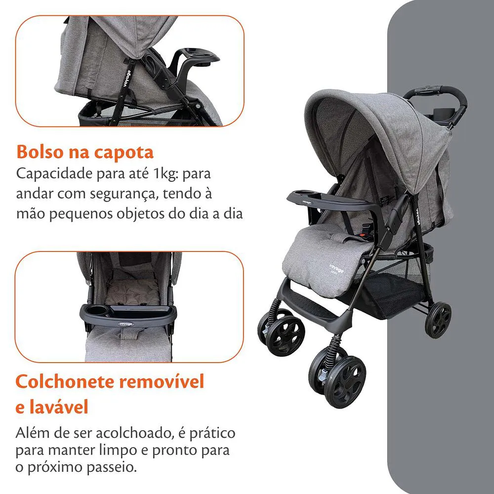 O Carrinho de Bebê Jobim da Voyage é a escolha perfeita para garantir o conforto e praticidade do bebê desde o nasciemnto até os 15kg. Com um design versátil, este carrinho oferece diversas funcionalidades que tornam o dia a dia mais simples e confortável para pais e filhos.BRBRCaracterísticas:BR• Múltiplas Inclinações do Encosto: Proporcionam ao bebê opções de posicionamento confortável, adequando-se a diferentes momentos do dia.BR• Assento Reclinável Tipo Berço: Permite que o bebê descanse de forma segura e confortável.BR• Colchonete Removível e Lavável: Facilita a limpeza e a manutenção do carrinho, mantendo tudo organizado e higiênico.BR• Apoio Ajustável dos pés: Oferece conforto para o bebê, ajustando-se conforme o crescimento e desenvolvimento dele.BR• Cesto Espaçoso: Ideal para armazenar fraldas, roupas e brinquedos, garantindo praticidade nos passeios.BR• Bandeja Frontal e Traseira Removíveis: Facilitam o acesso aos alimentos e objetos do bebê, tornando o momento do lanche mais prático.BR• Capota Retrátil com Visor e Bolso: Proporciona proteção solar e um espaço adicional para guardar pequenos objetos, como celular e chaves.BR• Freio Centralizado e Rodas com Trava de Movimento: Garantem segurança e estabilidade durante os passeios, permitindo maior controle e tranquilidade.BR• Fechamento com Apenas uma Mão: Prático e funcional, possibilita fechar o carrinho de forma rápida e conveniente, facilitando o transporte.BR• Cinto de Segurança Ajustável de 5 Pontos: Assegura a proteção e conforto do bebê, acompanhando seu crescimento e garantindo a segurança necessária.BR• Aprovado pelo Inmetro: Atende aos padrões de segurança e qualidade estabelecidos.BRBRCom o Carrinho de Bebê Jobim Voyage, você e seu bebê terão momentos incríveis juntos, seja em casa ou na rua. Conforto, segurança e praticidade se unem neste carrinho que foi pensado para tornar o dia a dia mais leve e especial para toda a família. Garanta já o seu e proporcione ao seu bebê o melhor em conforto e bem-estar!