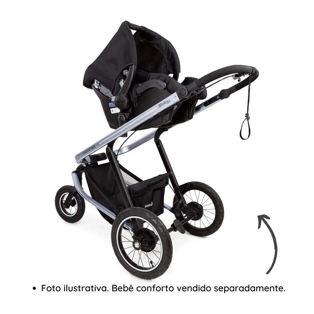Carrinho de Bebê Mobi Go Track Field - Safety 1stBRBRO Carrinho Mobi Go Track Field da Safety 1st é a escolha ideal para famílias que levam uma vida ativa e querem manter o estilo sem abrir mão da funcionalidade. Desenvolvido em parceria com a TrackField, ele oferece estrutura esportiva, conforto para o bebê e praticidade para os pais. Com grandes rodas infláveis, freio na manopla e capota com proteção UV50+, o Mobi Go garante passeios tranquilos em qualquer terreno e clima.BRBRCaracterísticas do Produto:BR• Design esportivo exclusivo: Com estampa TrackField, faixas refletivas e detalhes modernosBR• Compatível com bebê conforto: Pode ser usado com modelos Citi e Citi² (não inclusos)BR• Capota ampla e impermeável: Com aba de sol, visor, tecido leve e proteção UV50+BR• Ajuste de inclinação com uma mão: Transforma facilmente em modo moisésBR• Rodas grandes infláveis: Raiadas, com amortecimento traseiro e bomba inclusaBR• Freio nas mãos e nos pés: Dupla segurança com acionamento na manoplaBR• Fivela com encaixe magnético: Mais agilidade ao prender o bebêBR• Amplo cesto de carga: Capacidade para até 5 kg, com bolso integradoBR• Porta-garrafa e porta-objetos térmicos: Ideais para lanches ou mamadeirasBR• Bolsos laterais com velcro: Praticidade no dia a diaBR• Pulseira de segurança: Tira ajustável para maior controleBR• Manopla com ajuste de altura: Conforto para pais de diferentes estaturasBR• Barra frontal removível ou com aberturaBR• Assento com costuras exclusivas TrackField e tecido respirávelBRBREspecificações Técnicas:BR• Indicação: 0 meses a 15 kgBR• Tipo: Moisés e PasseioBR• Fechamento: Tipo envelopeBR• Reclinável: 3 posições de inclinaçãoBR• Assento reversível: SimBR• Rodas: 3 rodas grandes com pneus infláveisBR• Freios: Nas rodas traseiras (pé) e manopla (mãos)BR• Trava de direção: Giro 360° com trava nas rodas dianteirasBR• Amortecedores: Sim, nas rodas traseirasBR• Cinto de segurança: 5 pontos com protetores acolchoados e ajuste de altura e larguraBR• Capota: Com visor, aba de sol, proteção UV50+ e tratamento impermeávelBR• Material: Estrutura em alumínio e plástico; têxtil 100% poliésterBR• Dimensões: 114 x 65 x 99 cm (A x L x P)BR• Peso do produto: 14,1 kgBR• Registro: 000108/2024BR• Conteúdo da embalagem: 1 carrinho, 1 manualBR• Garantia do fornecedor: 12 mesesBRBRO Carrinho Mobi Go Track Field é a combinação perfeita de tecnologia, esportividade e estilo para acompanhar todos os momentos em família.