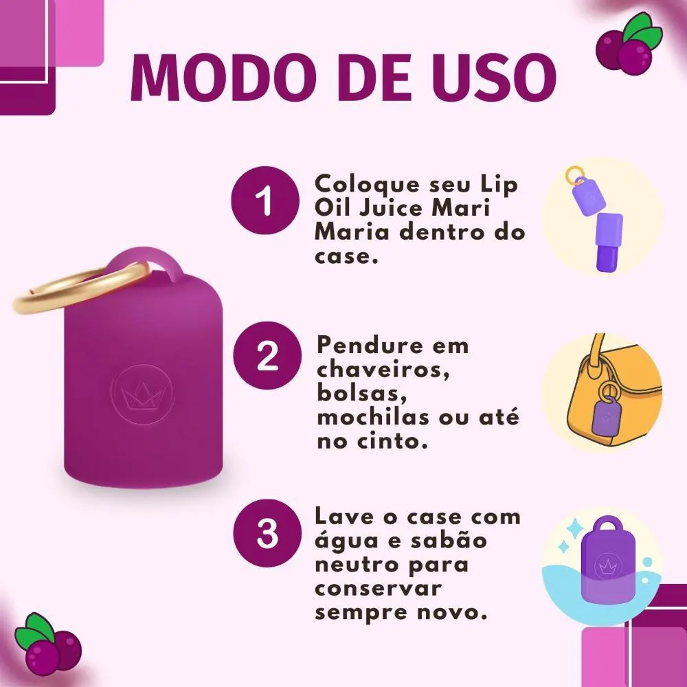 Protege seu lip oil contra impactos e quedas, prolongando a vida útil do produto.Mantém seu lip oil sempre acessível e ao seu alcance.Adiciona um toque fashion e moderno ao seu dia a dia.Garante que seu lip oil esteja sempre por perto e pronto para usar.