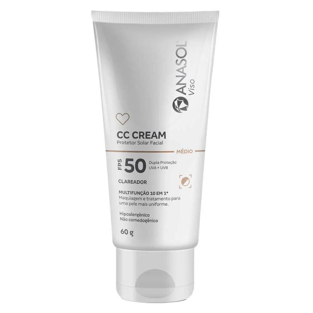 O Cc Cream Facial Fps50 Anasol é um produto multifuncional que combina maquiagem e tratamento para a pele, com proteção solar. Trata-se de um creme com ação clareadora que se adapta aos diferentes tons de pele, oferecendo cobertura natural e uniformidade.
