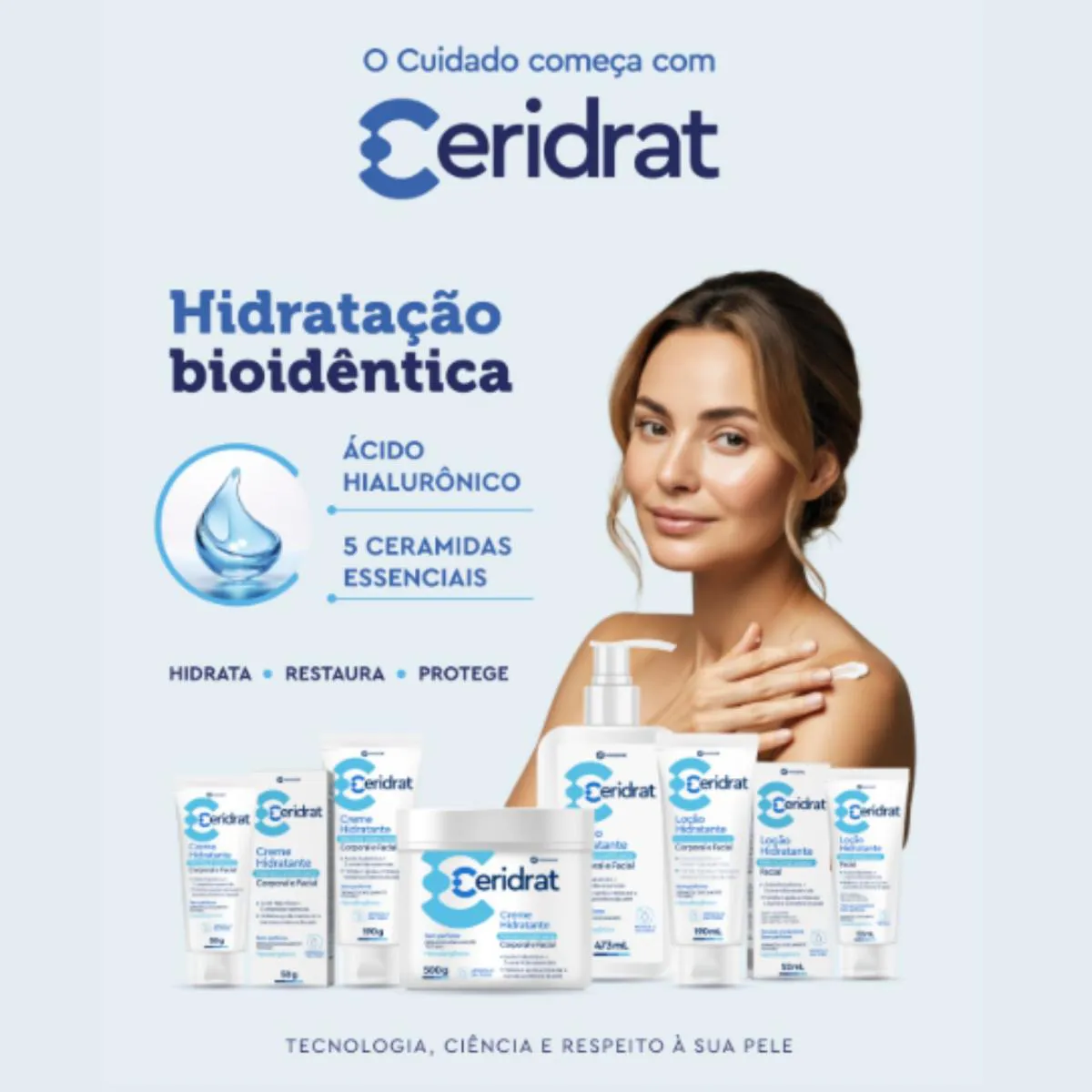 Com 5 ceramidas bioidênticas, ácido hialurônico e niacinamida (vitamina B3), a linha Ceridrat foi desenvolvida para restaurar, proteger e hidratar profundamente, com textura leve e toque seco.