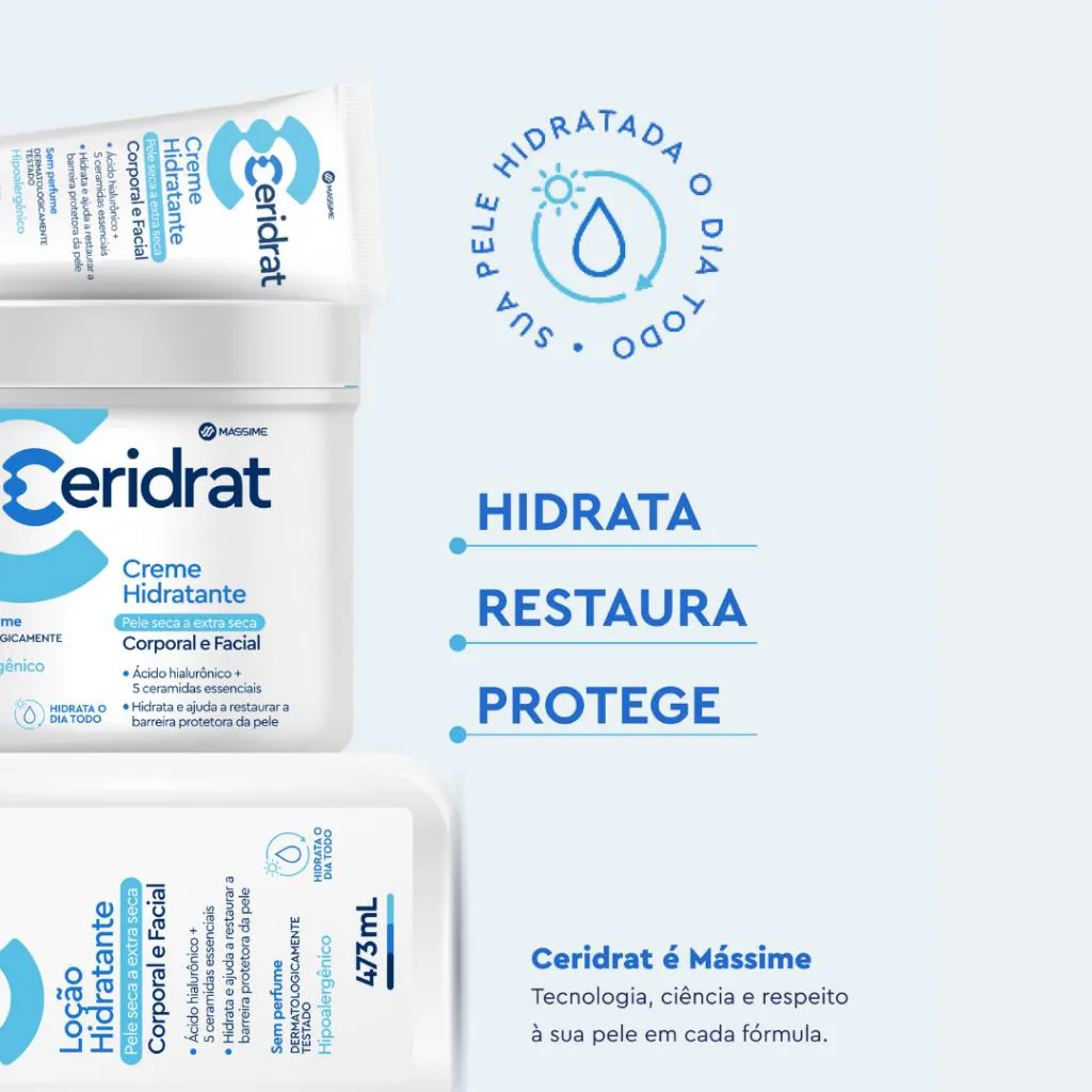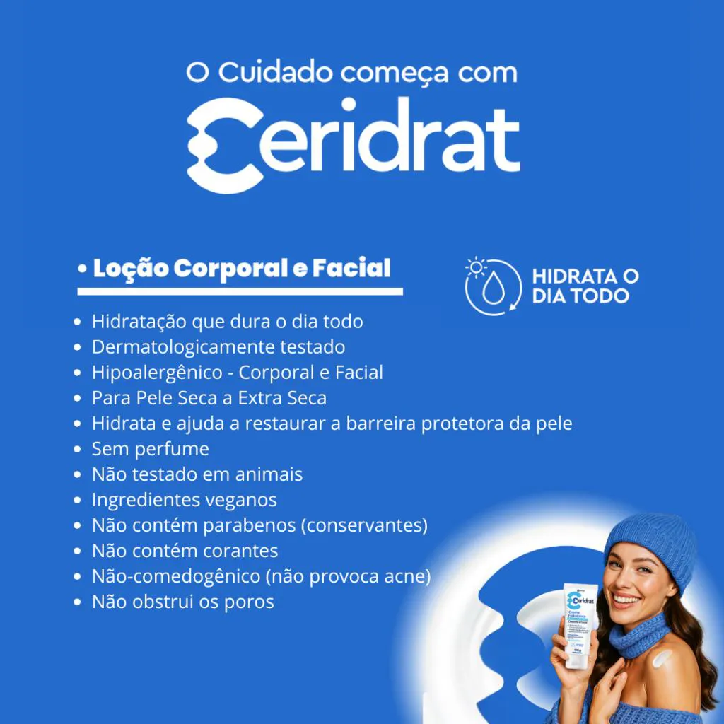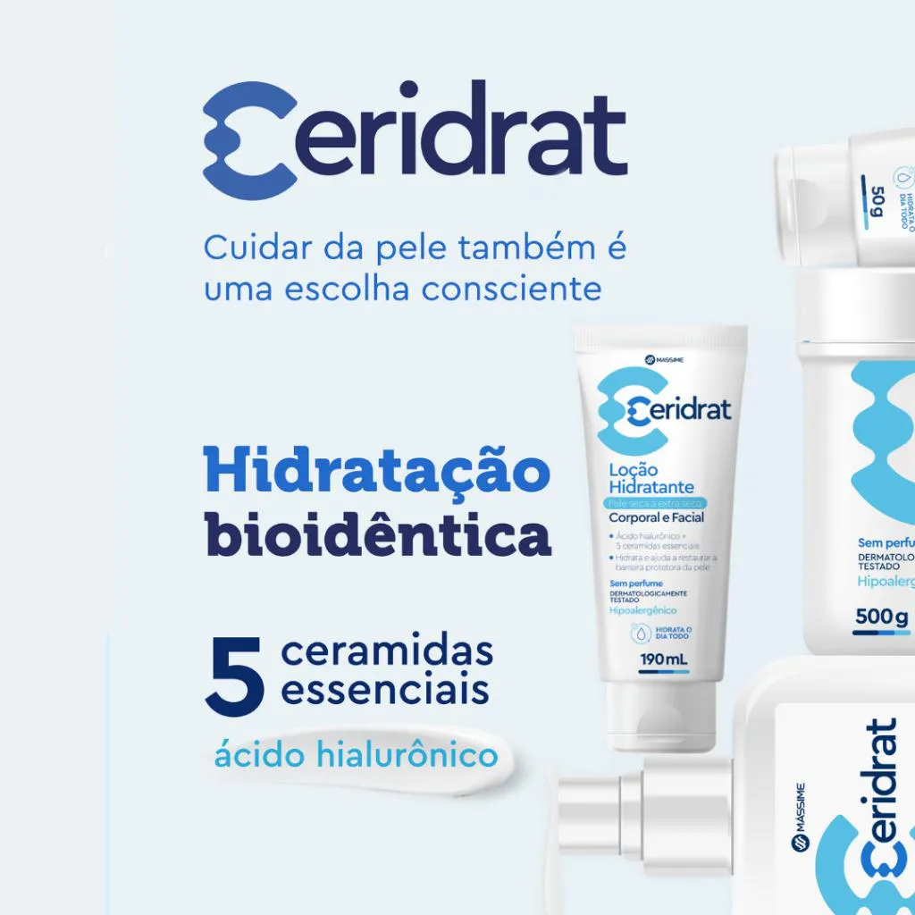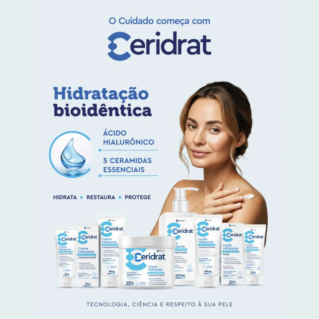 Desenvolvido e aprovado por dermatologistas, CERIDRAT é uma linha de hidratantes de alta performance a base de 5 Ceramidas e Ácido Hialurônico, para o cuidado que respeita a biologia da pele. Suas fórmulas são dermatologicamente testadas, seguras e eficazes na restauração e manutenção da barreira protetora da pele.