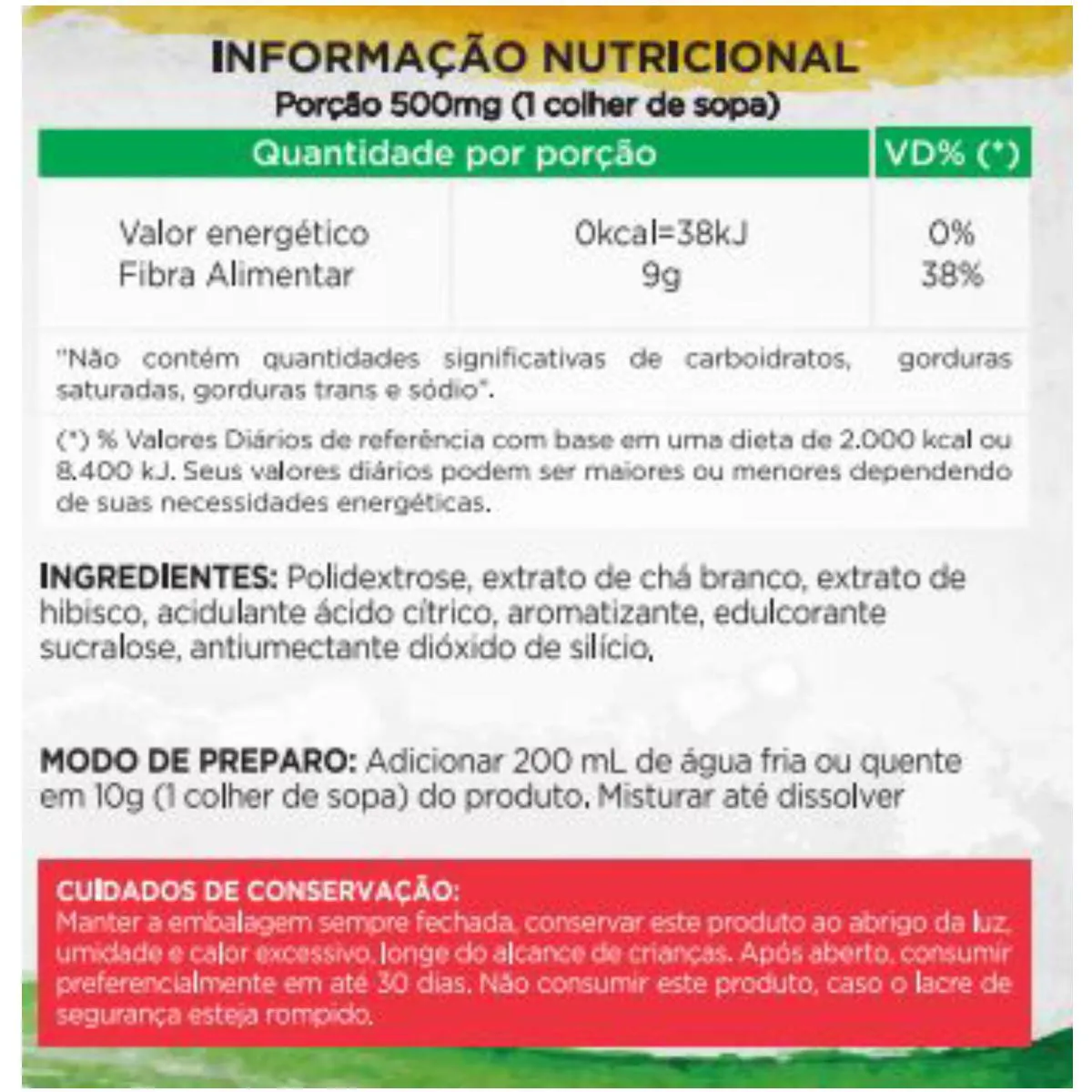 Polidextrose, extrato em pó de chá branco, extrato em pó de hibisco, acidulante ácido cítrico, aroma idêntico ao natural de frutas vermelhas, edulcorante glicosídeo de esteviol e antiumectante dióxido de silício.