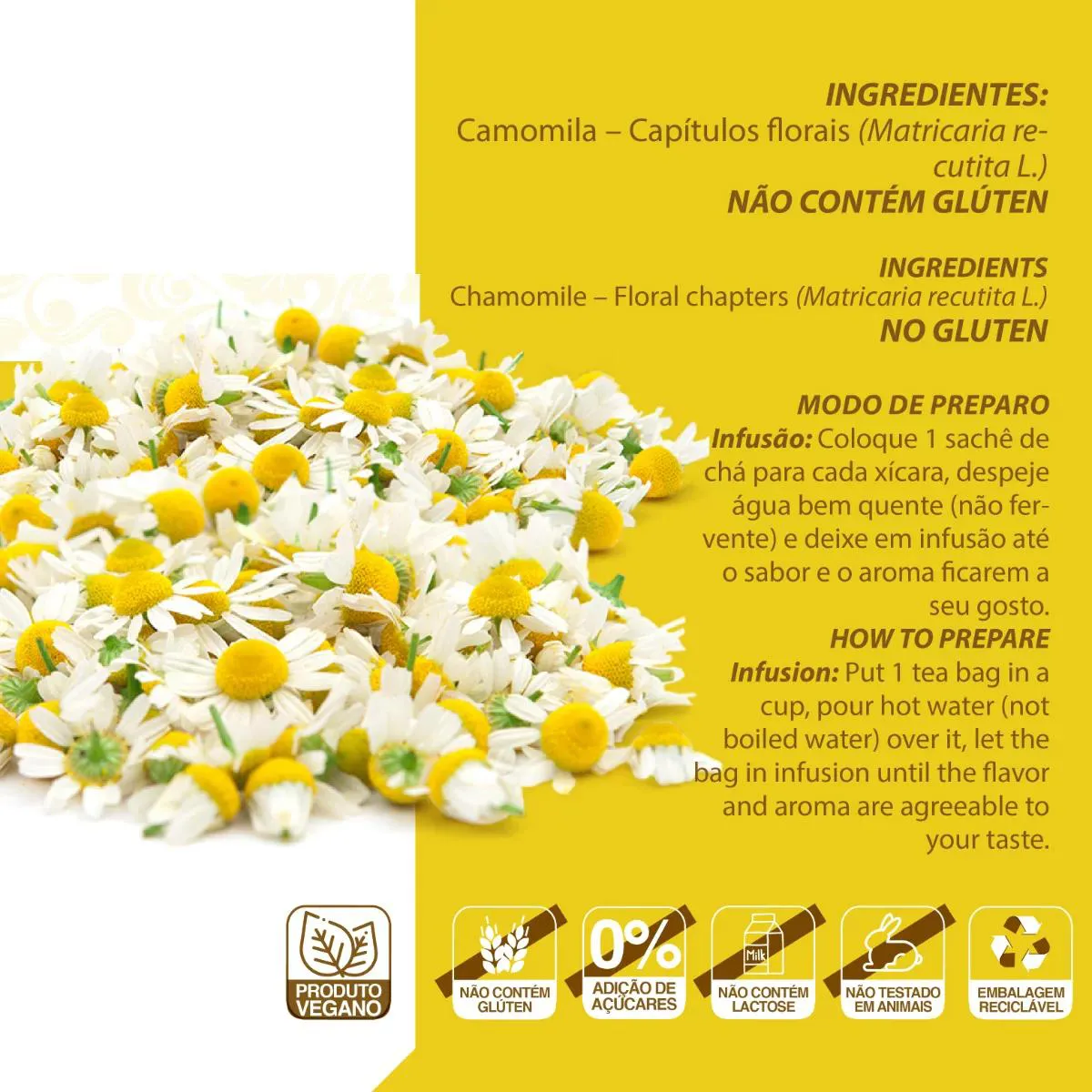 Chá Camomila Clinic Mais 10 Sachês 10g Sobre o Produto: O chá de camomila cháMais possui propriedades anti-inflamatória e antiespasmódica. Possui benefícios calmantes e digestivos, auxiliando a aliviar o estresse, insônia e problemas estomacais. Modo de preparo: Coloque 1 sachê de chá para cada xícara, despeje água bem quente (não fervente) e deixe em infusão até o sabor e o aroma ficarem a seu gosto. Ingredientes: Camomila.